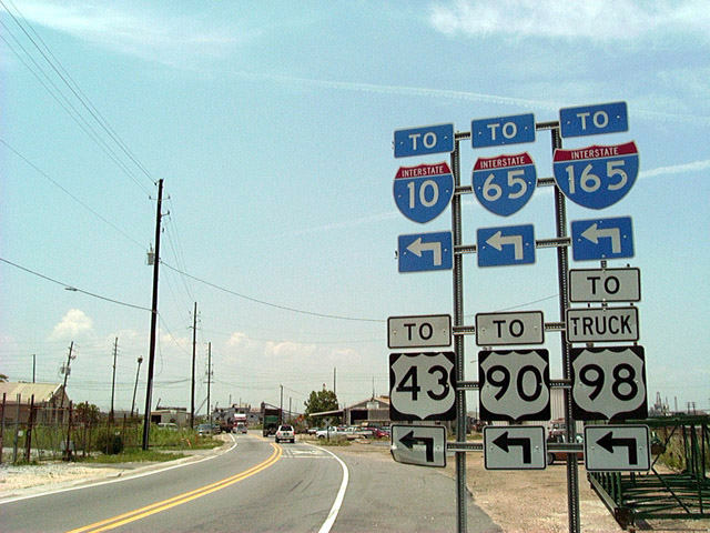 These trailblazers featuring all three Mobile area Interstates were posted in both directions on Dekle Drive. This assembly was removed by 2007. It preceded the wye intersection with Telegraph Road (former U.S. 43) by the Alabama State Docks. 06/03/02