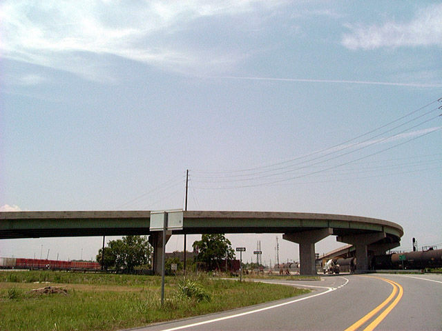 Emerging from the four-lane Wallace Tunnel, Interstate 10 ascends onto the Mobile Bayway. Also known as Jubilee Parkway, the Bayway spans the shallow waters of Mobile Bay along a viaduct system extending eight miles east to Spanish Fort and the Baldwin County Eastern Shore. U.S. 90/98 parallel the four-lane freeway along Battleship Parkway, a causeway just a few feet above sea level, nearby.