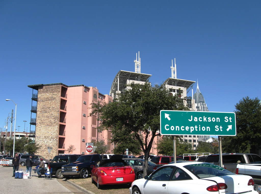 Conception Street branches away from Jackson Street and shifts two blocks eastward into Downtown. Joachim Street southbound enters opposite Conception to merge with Claiborne Street. 02/06/10