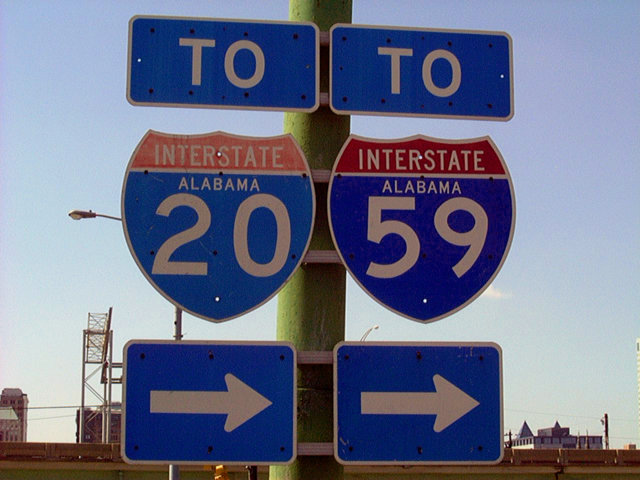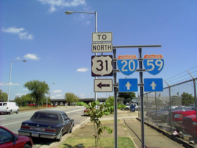 5th Avenue N eastbound ahead of 25th Street and the Elton B. Stephens Expressway viaduct. A replacement of this assembly added the missing TO banners for I-20 and I-59 and redirected traffic for U.S. 31 to remain east to upcoming 26th Street N. 10/01/03