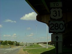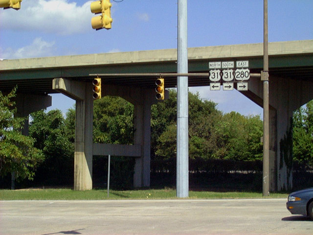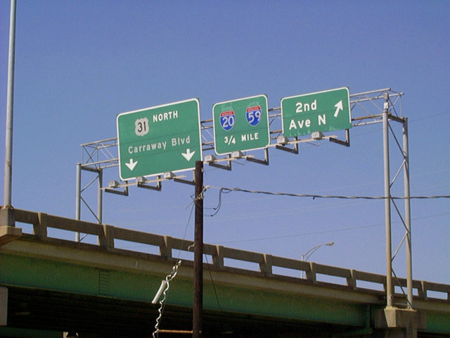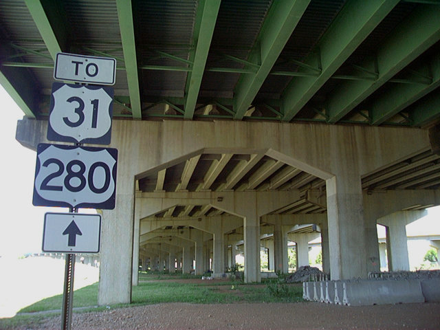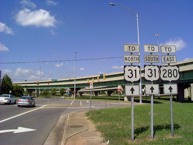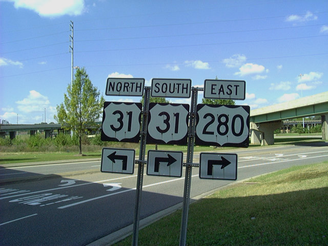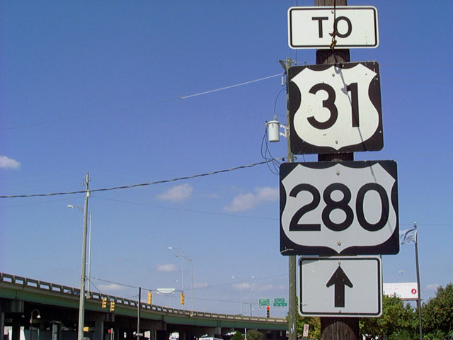 U.S. 31/280 trailblazers posted along 26th Street between 1st and 2nd Avenue N direct motorists six blocks northward to the intersection of Carraway Boulevard and Elton B. Stephens Expressway. 10/01/03