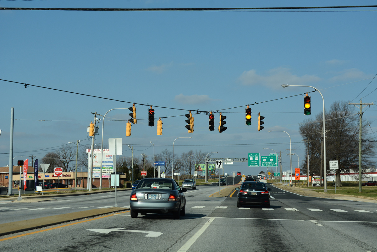 All guide signs for the cloverleaf interchange (Exit 1A) joining SR 141 (Basin Road) north with U.S. 13/40 (Dupont Highway) were carbon copied by 2012 to use Clearview font. This overhead was posted just ahead of Washington Avenue. 08/05/07