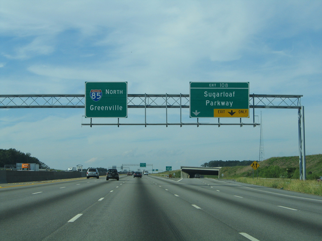 Interstate 85 north carried six lanes through to a lane drop at Exit 104 with Pleasant Hill Road. The freeway retains six lanes north to Georgia 316 now. 05/28/05