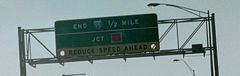The original sign placed one half mile ahead of the I-95 ending merge with U.S. 1 south featured a red shield with holes in it. Richard Ray wrote, "When I lived in South Florida in the 1960s and 1970s they used to have flashing (wig-wag) yellow lights there (in the holes). I guess the FDOT got tired of replacing the light bulbs, or they thought no one was paying attention to them anyway. Alabama has similar lights on their approaches to the George Wallace Tunnel on Interstate 10. Traffic has to slow from 55 to 45 mph to get through the tunnel due to a sharp curve on the westbound side. Lots of marks on the Jersey barriers there." 12/27/99