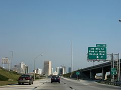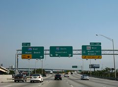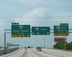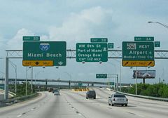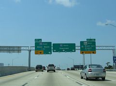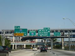The left two lanes leave I-95 south for Interstate 395 eastbound, which travels on an elevated viaduct past the northern edge of the financial district before ending quickly at Florida A1A (former U.S. 41). Near Bicentennial Park, I-395 becomes Florida A1A northbound, and Florida A1A follows the MacArthur Causeway (which is not Interstate standard) to Miami Beach. The causeway was designated as U.S. 41 until 1999, when the U.S. route was retracted to Downtown Miami at U.S. 1 (intersection of Biscayne Avenue and SE 8th Street). 05/16/08