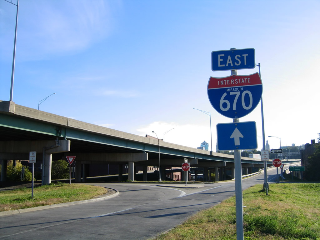 Exit 2Q separates from Interstate 670 (Dillingham Freeway) west at the Holmes Street (old U.S. 71 Business) overpass now. The exit previously left the freeway at the Locust Street overpass. 10/17/04