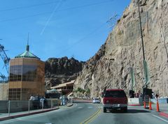 U.S. 93 reached the visitor facilities for viewing Hoover Dam. The tower to the left is the visitors center, and the parking area is located just past the center to the right (the parking garage is built into the wall of the canyon). 10/24/03