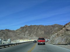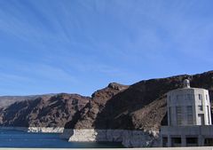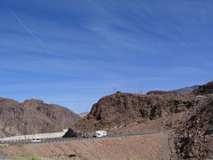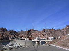 This view of Hoover Dam from U.S. 93 above the Black Canyon, showed the curved face of the concrete structure as well as the elevation difference between Lake Mead and the canyon downriver. 10/24/03