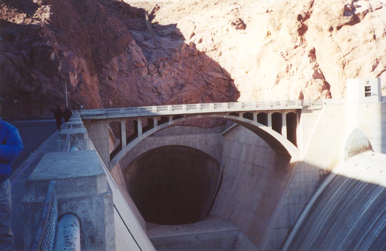 U.S. 93 crossed the top of Hoover Dam, which rises 726.40 feet from foundation rock to the roadway on the crest. Unlike most road beds, U.S. 93 rests on top of 3.25 million cubic yards of concrete! It took five years, from 1931 to 1935, to construct Boulder Dam, which was later renamed for President Herbert Hoover. 10/24/03