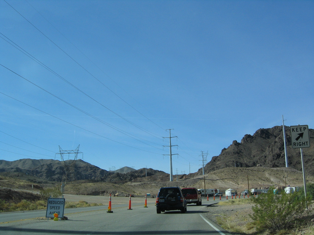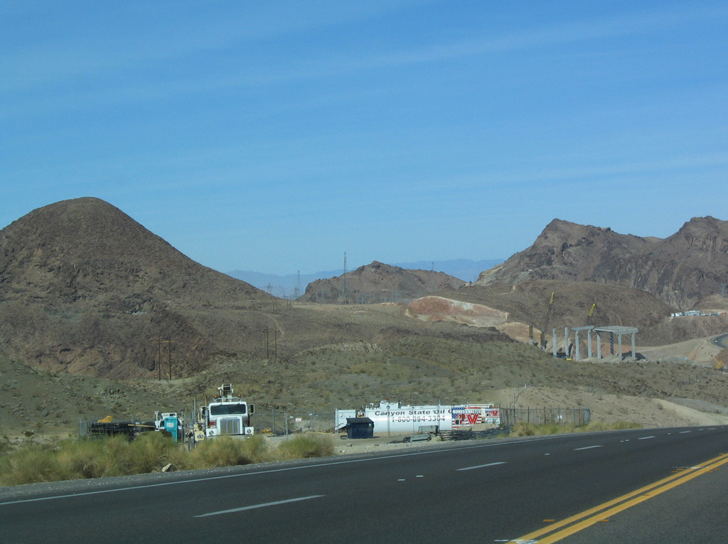 U.S. 93 northbound passing the security checkpoint for southbound travelers. Transmission lines installed by 2003 provide additional electricity into the Nevada power grid. 10/24/03