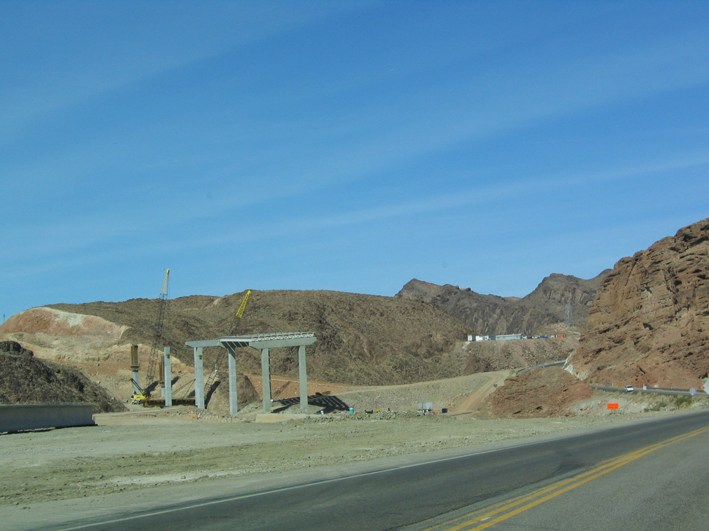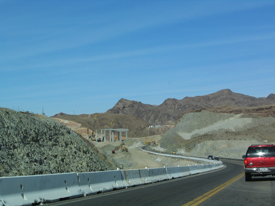 Coupled with a steel arch bridge over Black Canyon, the Hoover Dam Bypass shifted all through traffic off the dam, greatly improving traffic flow and removing the commercial vehicle prohibition along U.S. 93. 10/24/03