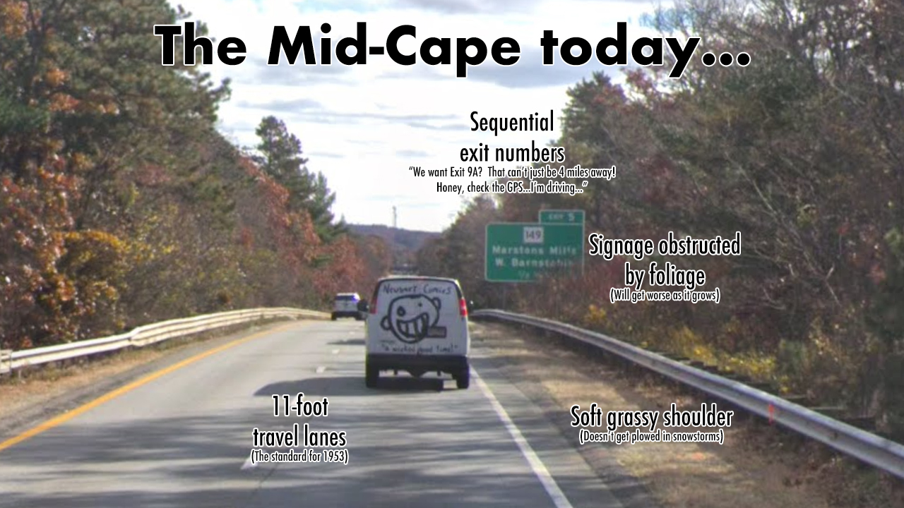 I think I get the impression of how obstinate they are.  I just don't care.  I'm willing to make REASONABLE compromise but not bend to their delusions.  If one of their complaints is that having the numbering start at RI isn't distinct enough for the Cape, fine, start it at Sagamore.  But don't keep it sequential or have something like "exit X mile Y" just because people on Cape Cod are entirely divorced from reality.  At some point someone needs to tell them what the actual definition of a freeway is and tell them that they're delusional if they continue to insist otherwise.