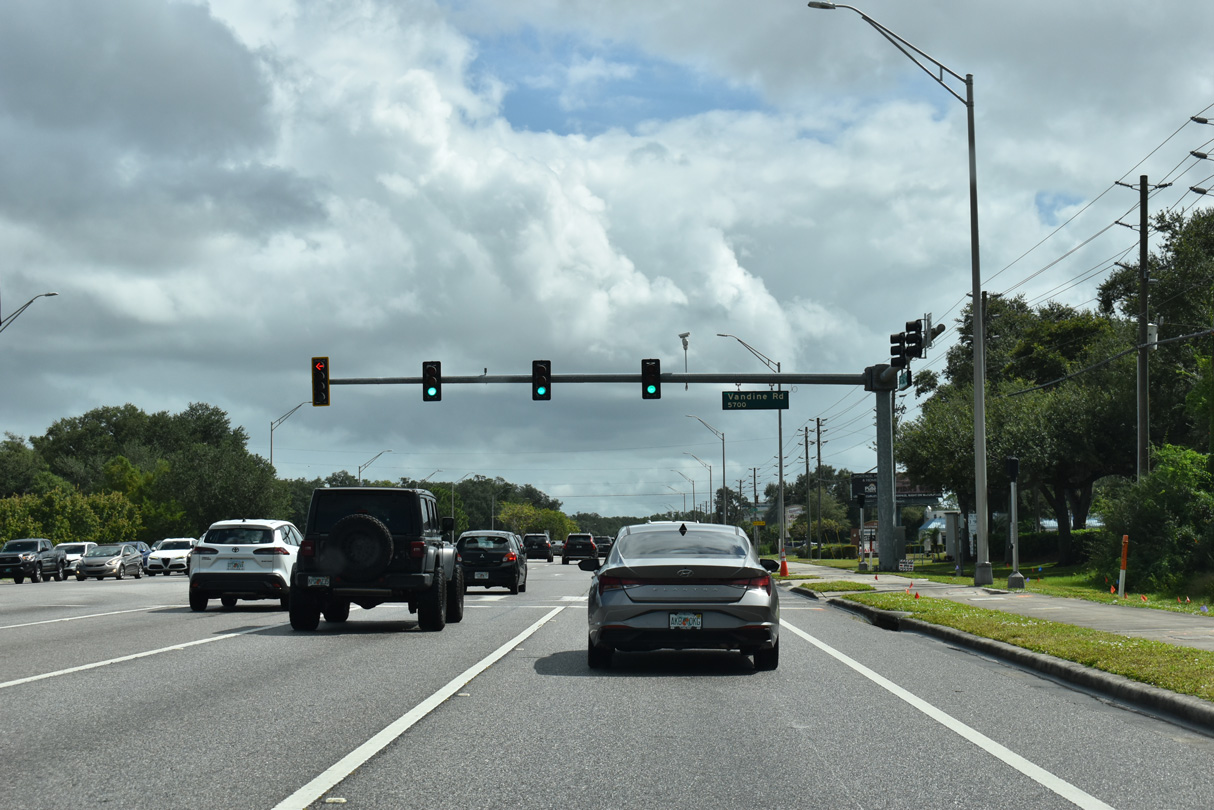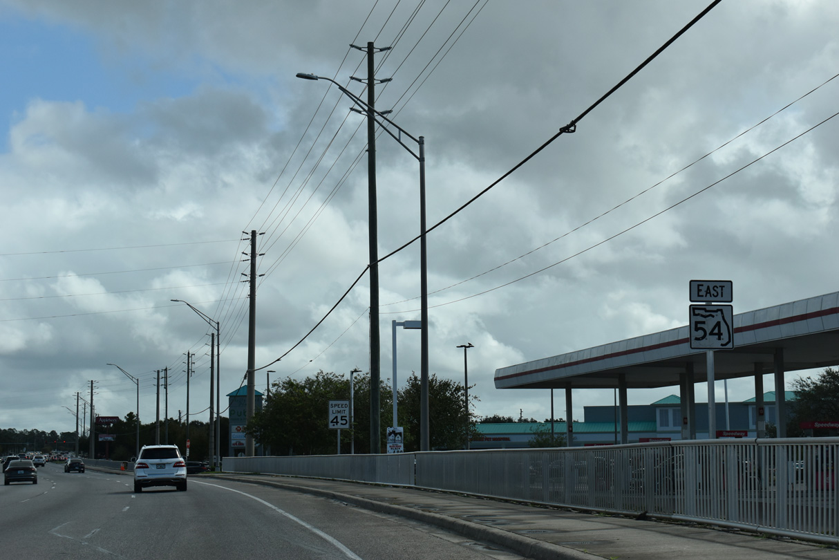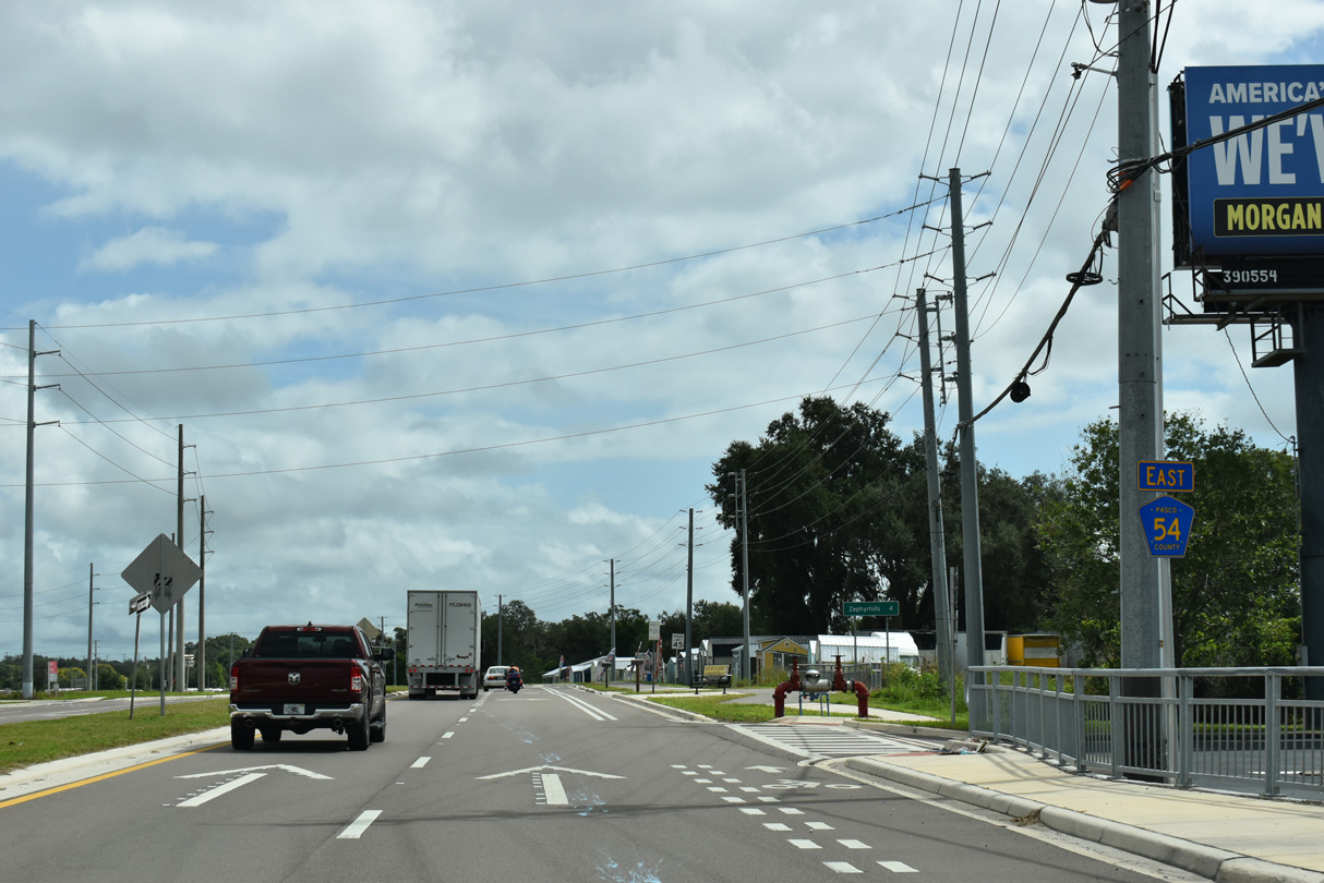 The four lane section of CR 54 concludes east of CR 579 (Morris Bridge Road) at Lake Crystal Boulevard.