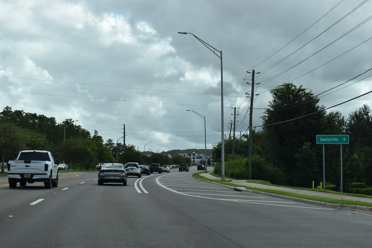 Zephyrhills Bypass branches east from CR 54 between CR 577 (Curley Road) and Chapel Crossings Boulevard. The westernmost portion of the suburban boulevard was built in anticipation of the cancelled Zephyrhills West Bypass Extension.