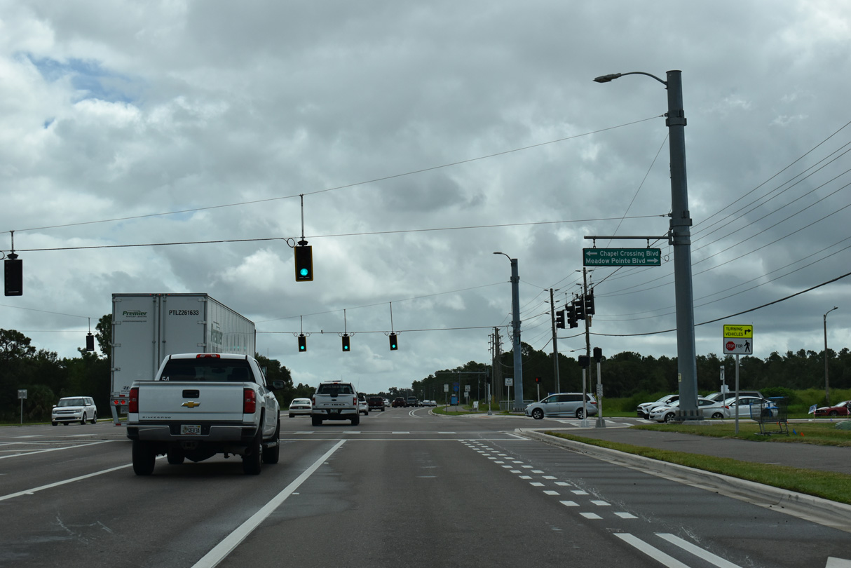 A lane drop occurs along CR 54 east from Meadow Point Boulevard south and Chapel Crossings Boulevard north at Foxwood Boulevard.
