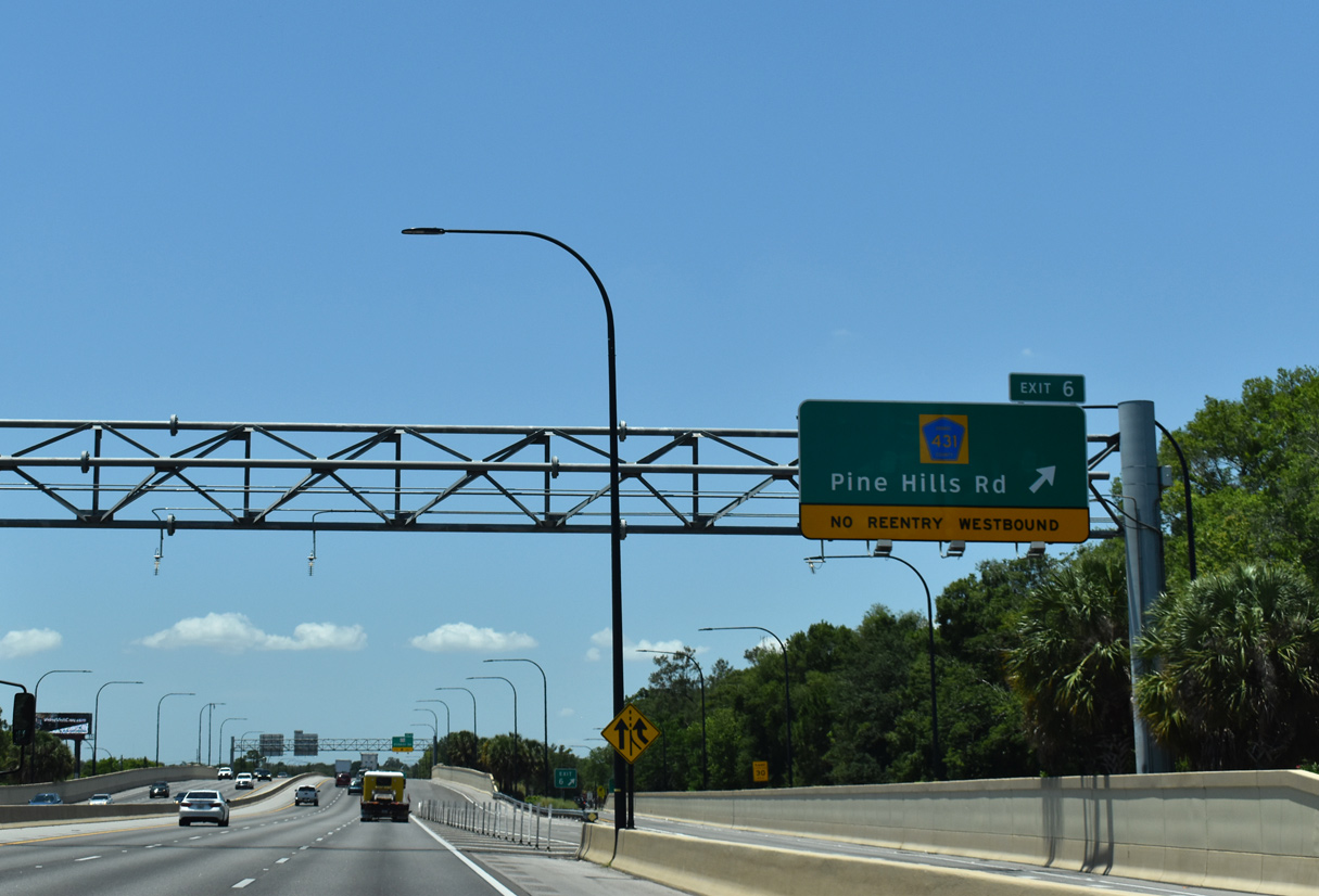 Pine Hills Road travels north from Old Winter Garden Road through Pine Hills to Beggs Road at Lockhart. The only signs for Orange County Road 431 are posted on guide signs along SR 408 westbound.