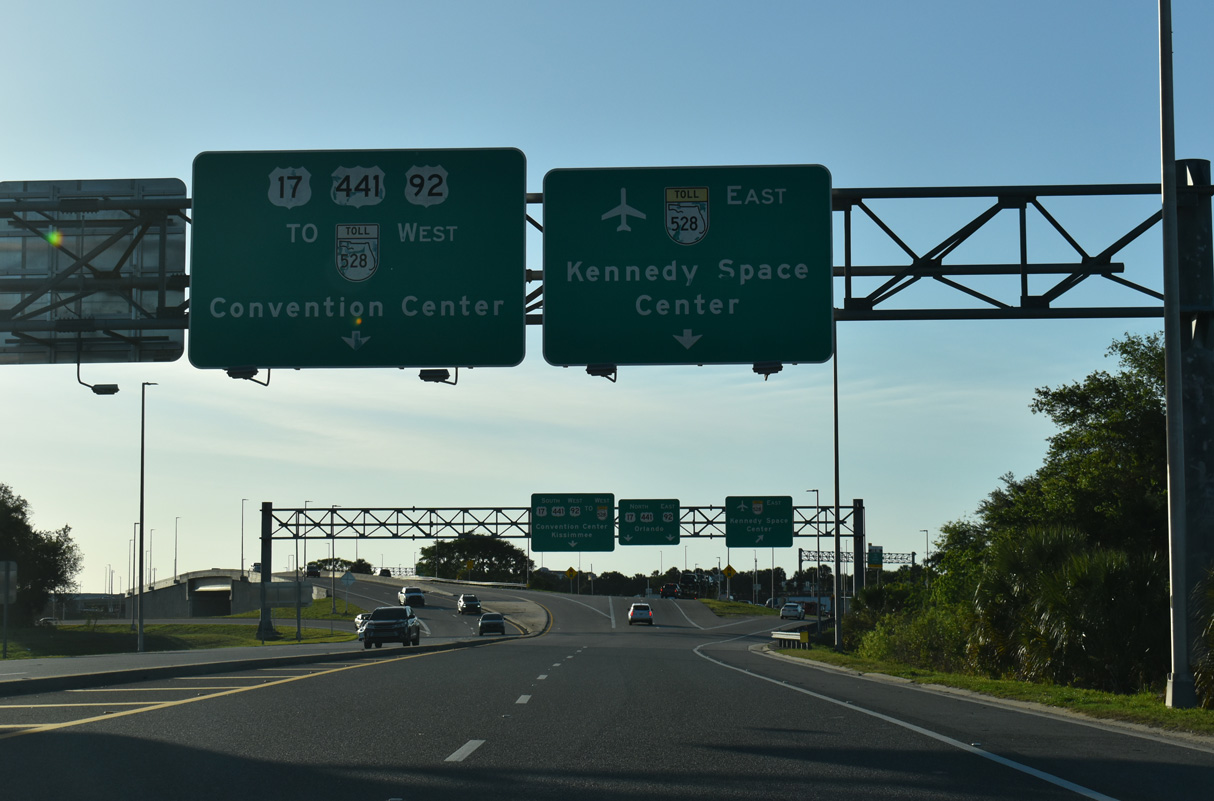 SR 528 Toll (Beachline Expressway) joins south Orlando and Walt Disney World with Orlando International Airport (MCO) and John F. Kennedy Space Center.