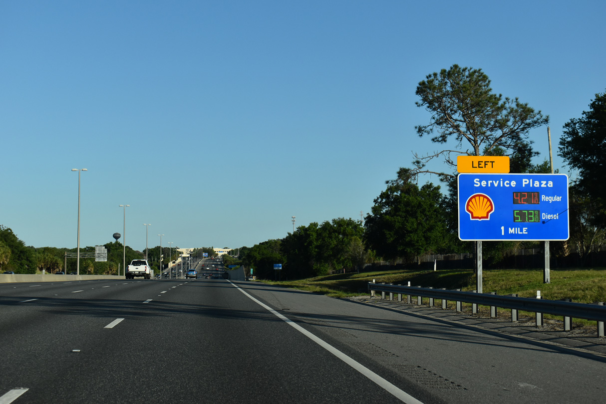 Food, fuel, and tourist information are available at Turkey Lake Service Plaza. Additionally complementary orange and grapefruit juice are served to visitors.