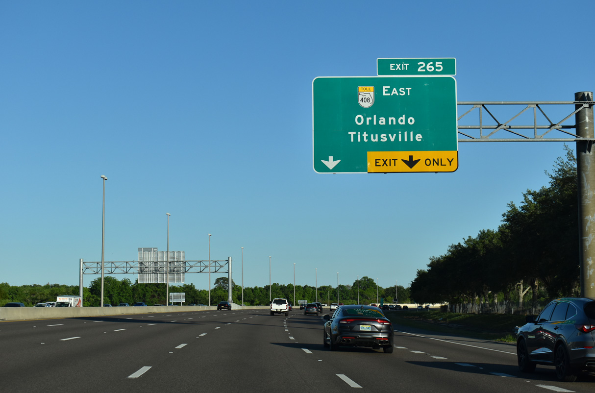 Exit 265 departs Florida's Turnpike south for the eastbound beginning of SR 408. The East-West Expressway travels 22 miles overall, reaching Downtown Orlando in ten miles.