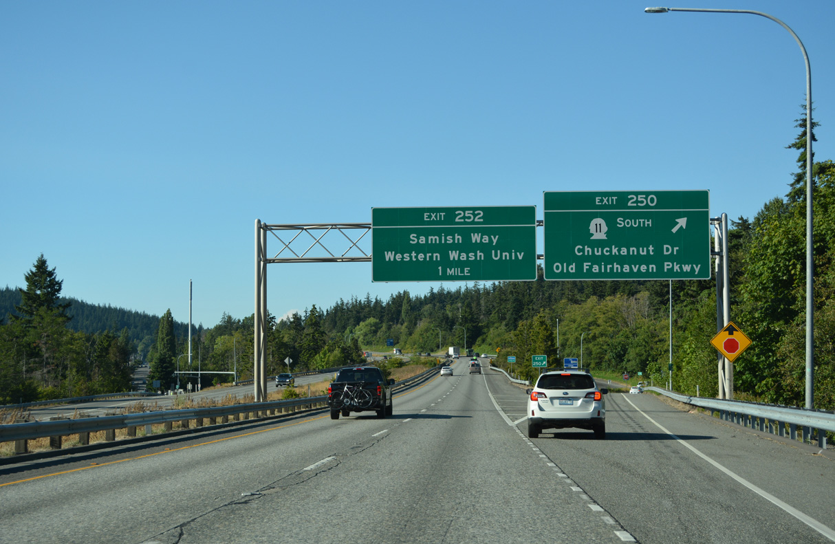Samish Way (old U.S. 99) converges with I-5 again at a split diamond interchange (Exit 252) east of Western Washington University. Samish Way crosses I-5 north from Elwood Avenue en route to Maple Street. The historic route of U.S. 99 followed Maple, Ellis and Holly Streets to the Bellingham city center.