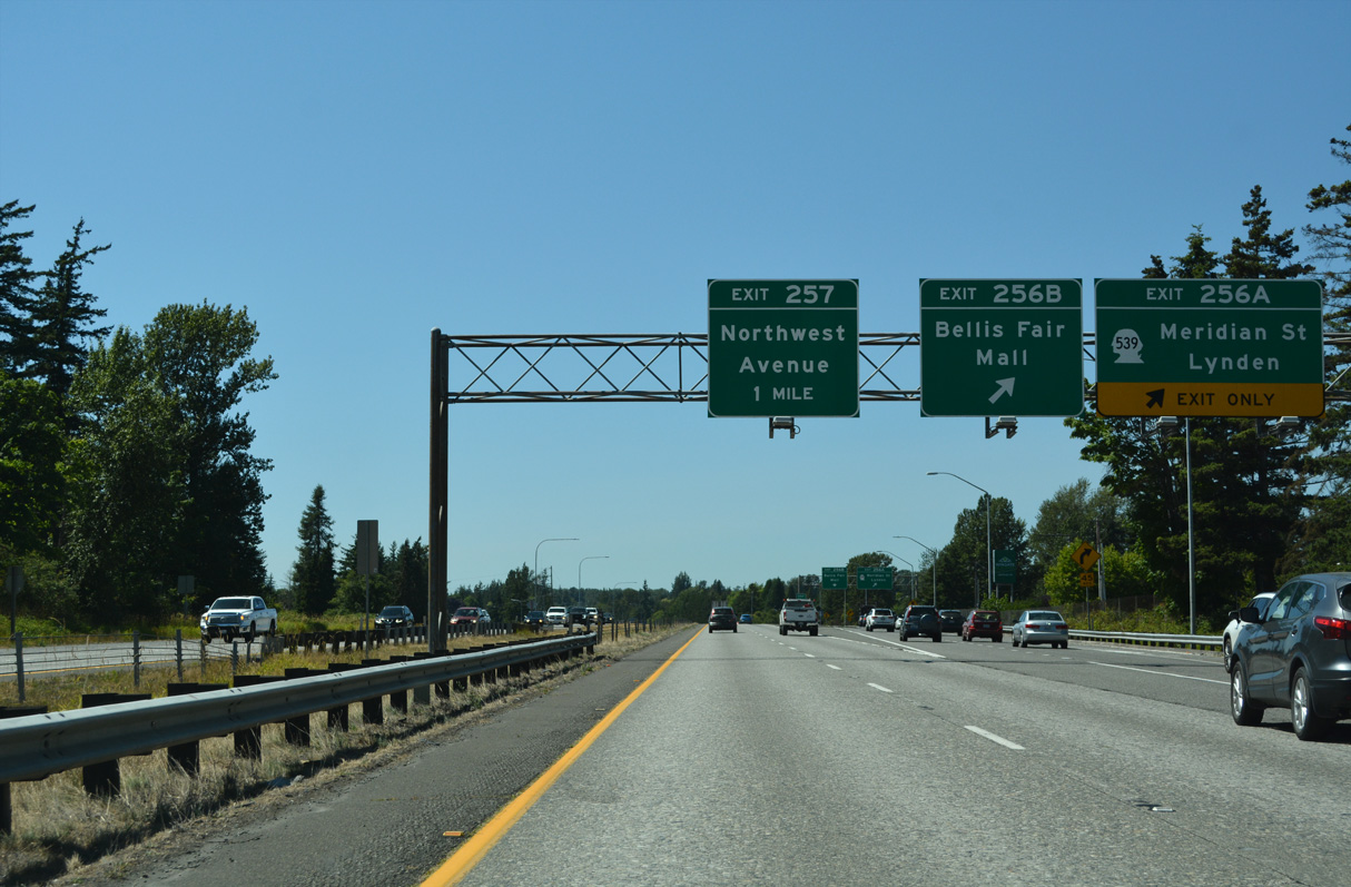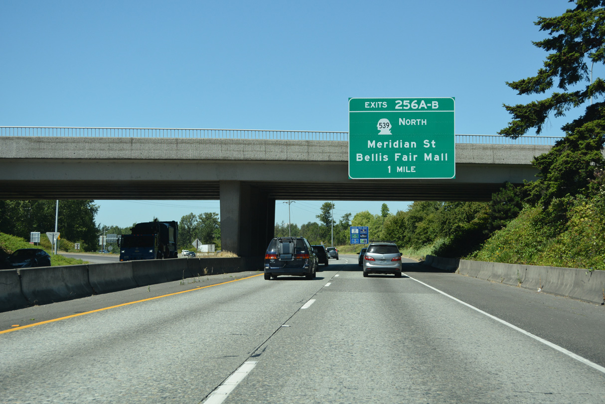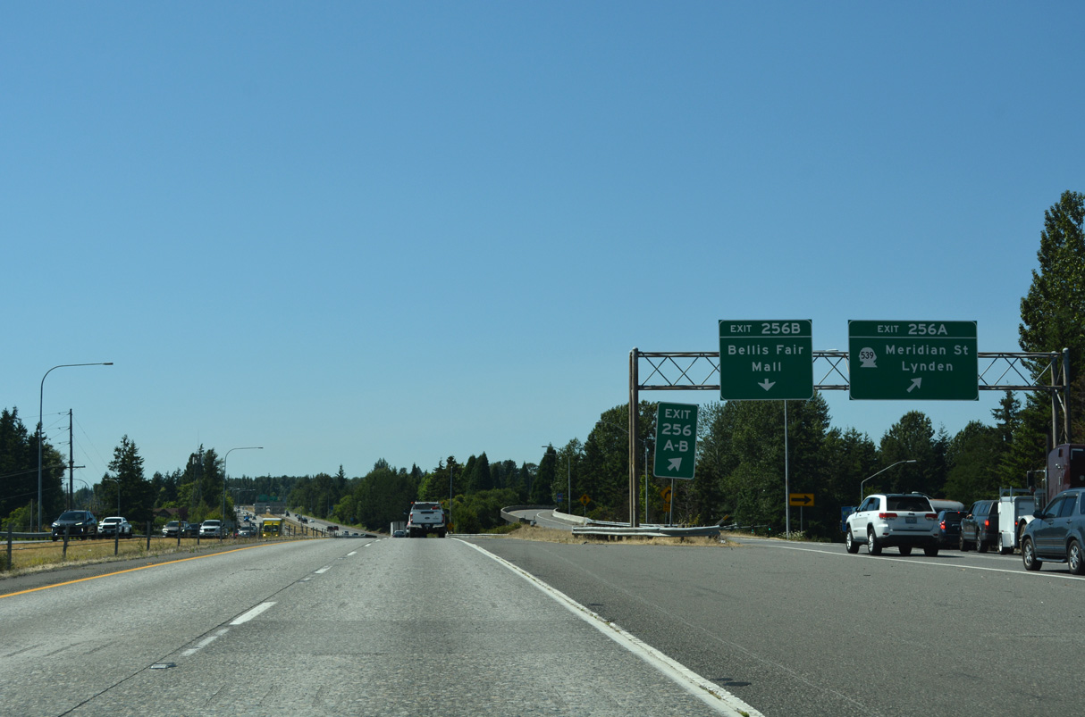 Curving west, Exits 256 A/B joins Interstate 5 next with SR 539 north at Meridian Street (Old U.S. 99 Alternate) and Bellis Fair Parkway at Bellis Fair Mall.