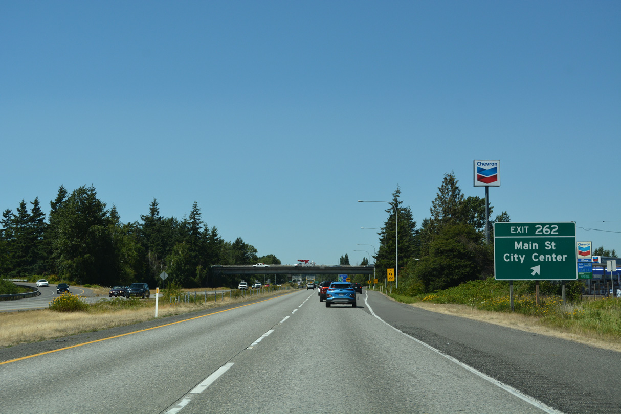 Exit 262 leaves Interstate 5 north for Axton Road east to SR 539 near Laurel and Main Street west to the Ferndale city center. Main Street becomes Mountain View Road west to Mountain View and Lake Terrell.
