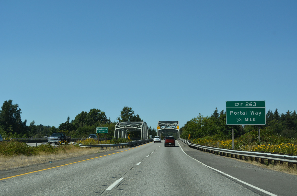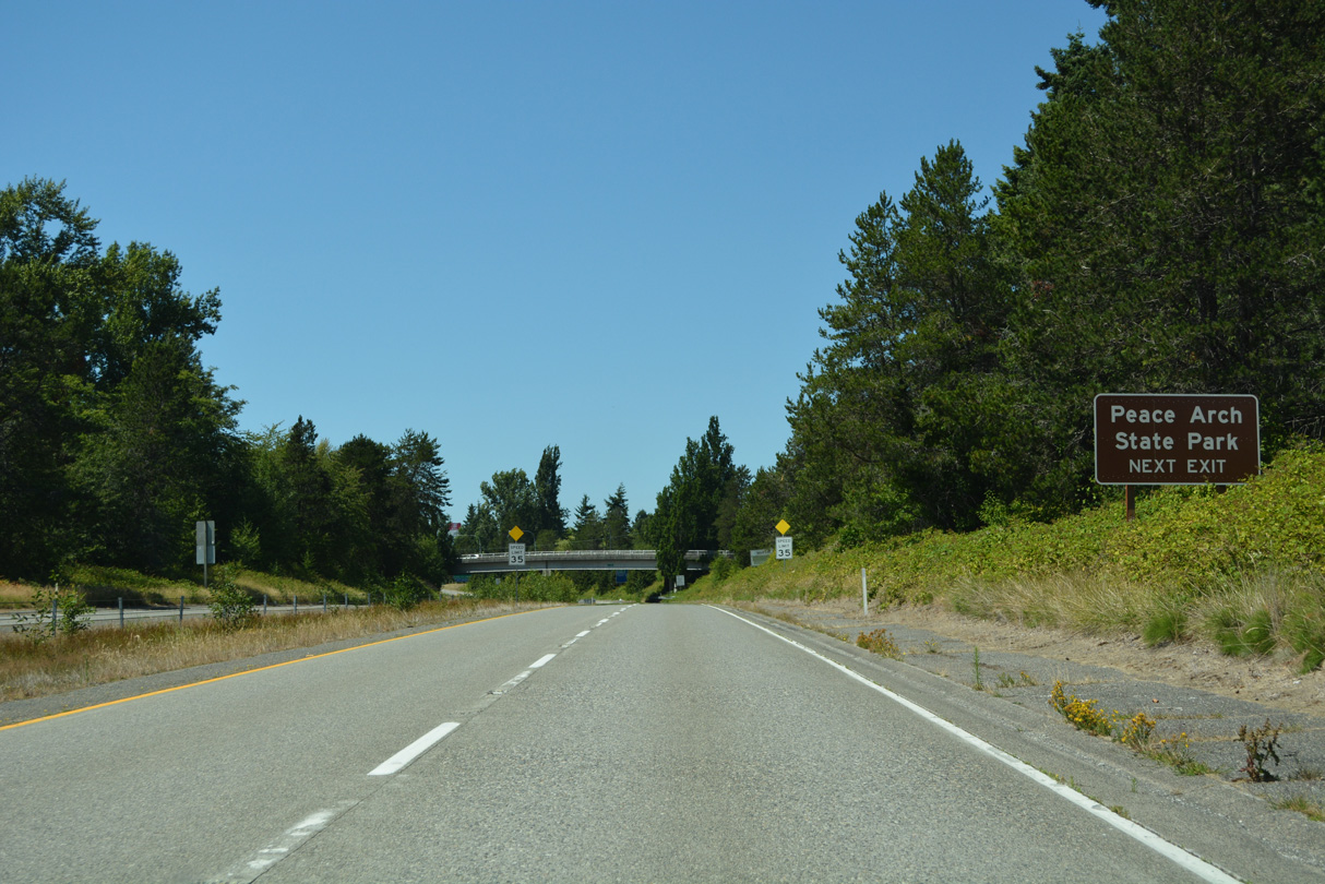 The last three exits from Interstate 5 north fall within the city of Blaine. First is the wye interchange (Exit 274) to Peace Portal Drive (old U.S. 99) after Dakota Creek.