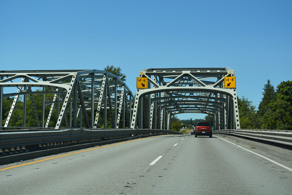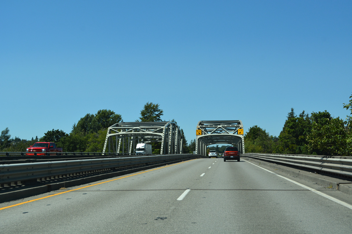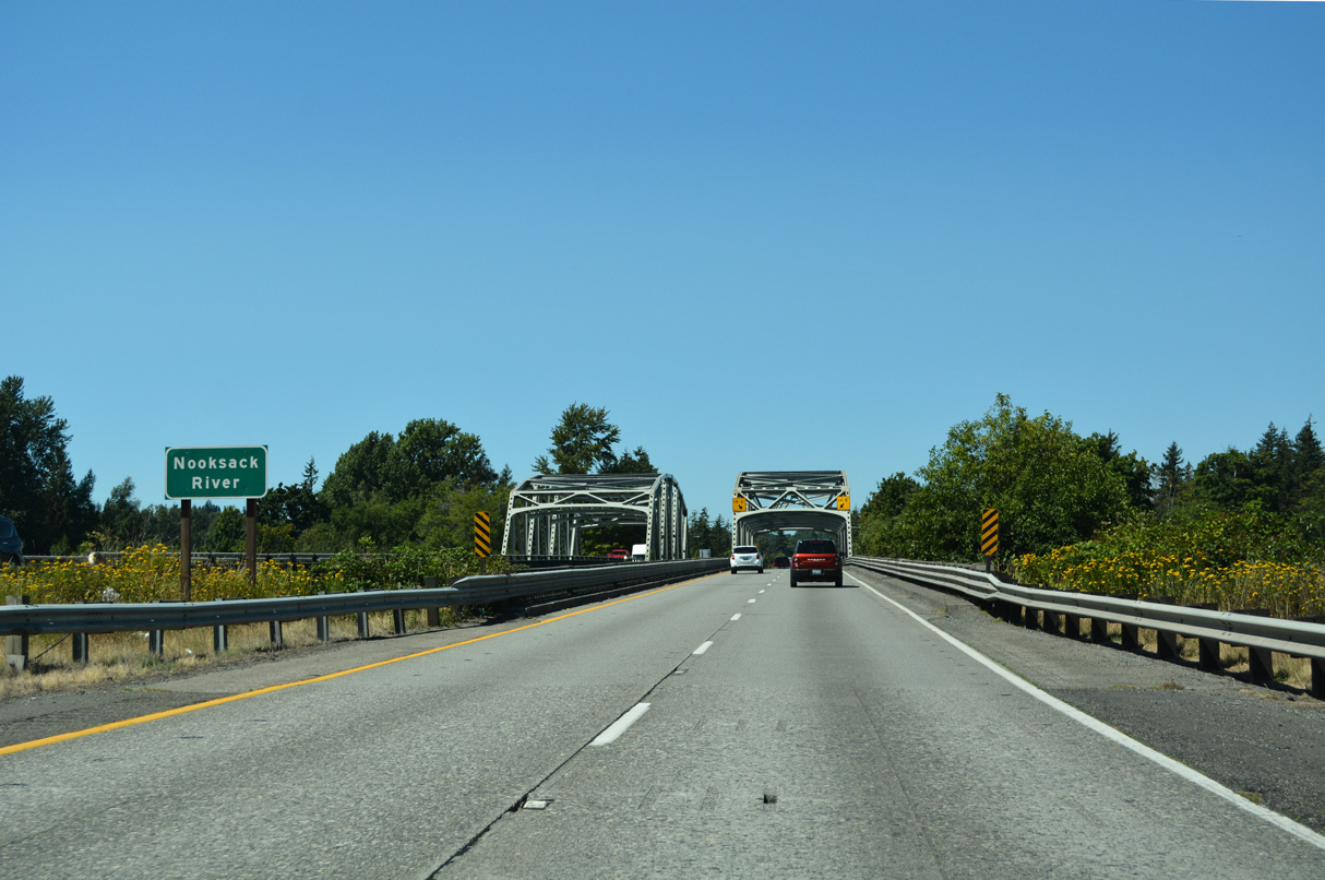 The northbound span across the Nooksack River opened in 1955 as a part of U.S. 99 (Pacific Highway). A wider southbound bridge was completed in 1971.