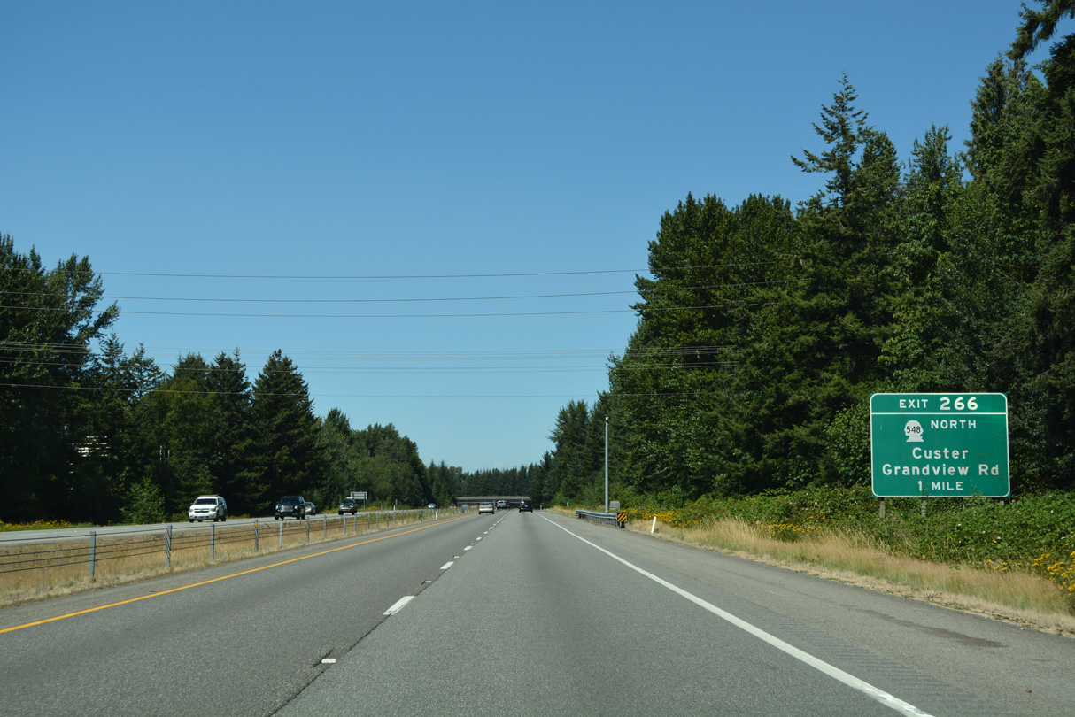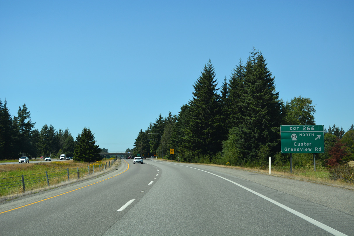 Grandview Road west becomes part of SR 548 at the diamond interchange (Exit 266) with Interstate 5. SR 548 loops west to Birch Bay along the 13.85 mile course north to Blaine.