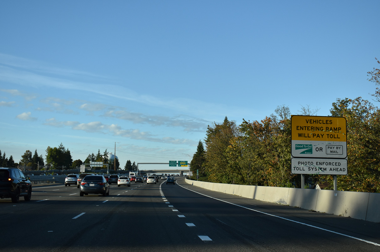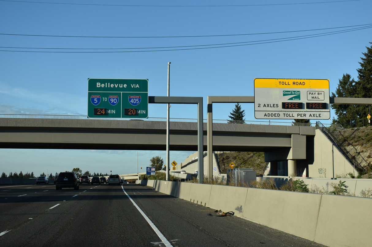 The exit for Interstate 90 east to Mercer Island, Bellevue, and Issaquah part ways from the c/d roadway along I-5 north. Interstate 90 meets I-405 at Exit 10 and I-82 at Exit 110. Spokane lies 275 miles to the east.