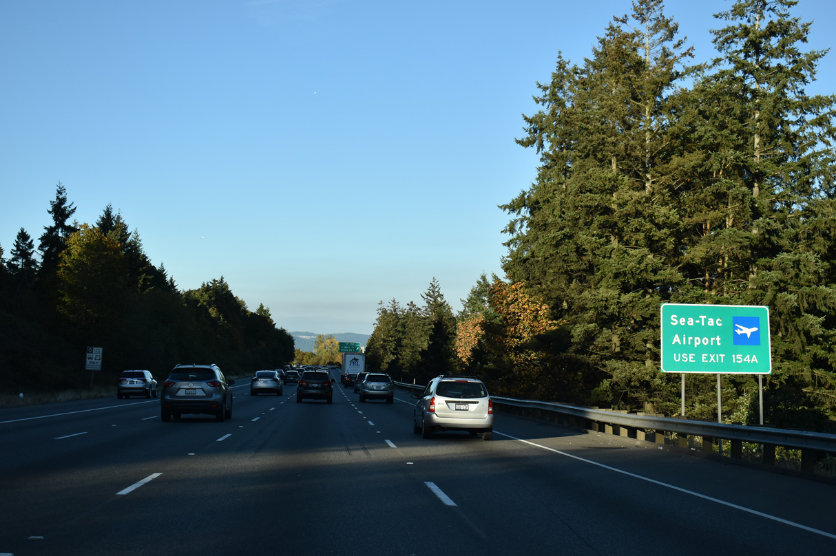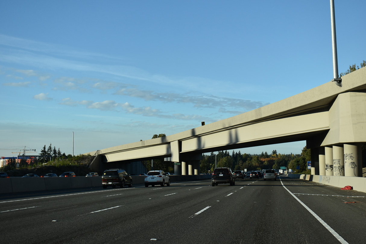 A brief roadway separation follows along Interstate 5 along the hills east of King County International Airport - Boeing Field (BFI).