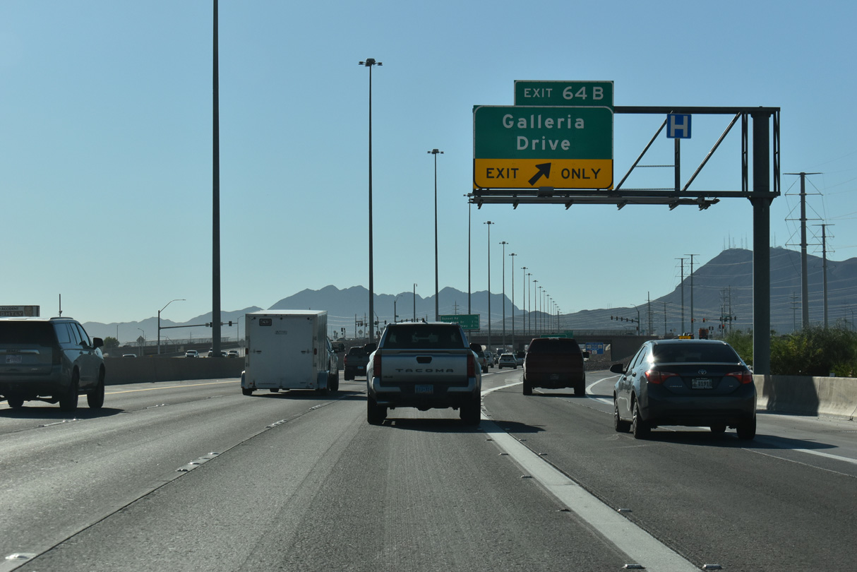 Opened by October 2009, Exit 64 B to Galleria Drive joins the Oran K. Gragson Freeway with Galleria at Sunset mall while serving as a relief route for nearby Sunset Road.