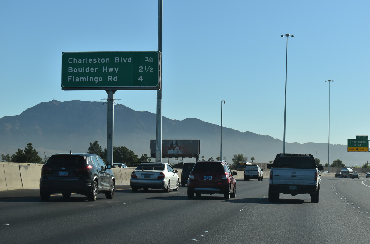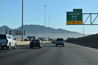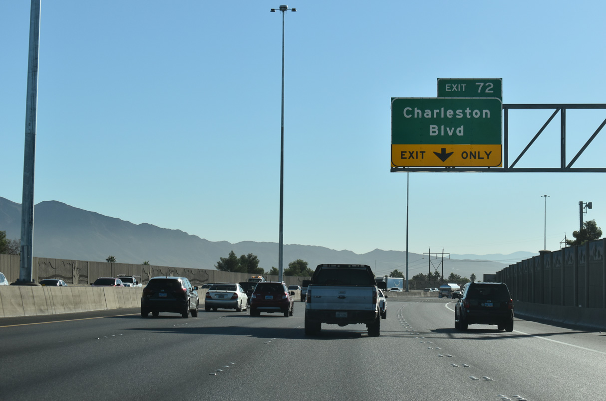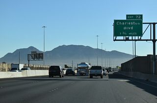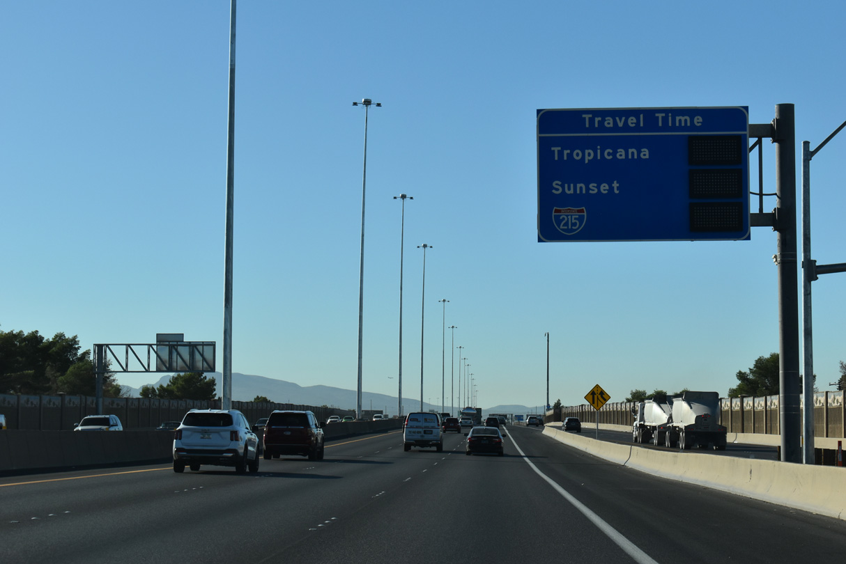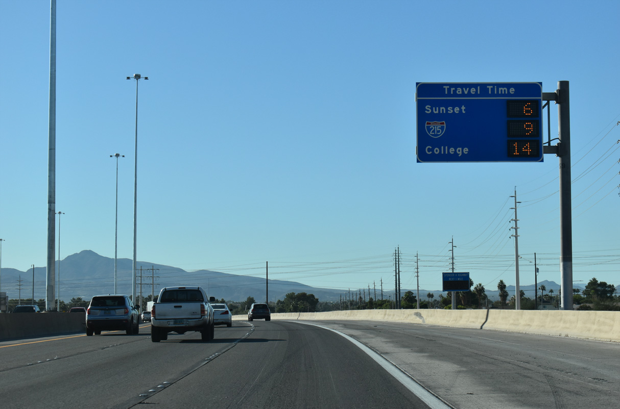 A travel time information board appears beyond the entrance ramp from Charleston Boulevard. Travel times vary throughout the day depending on the volume of traffic.