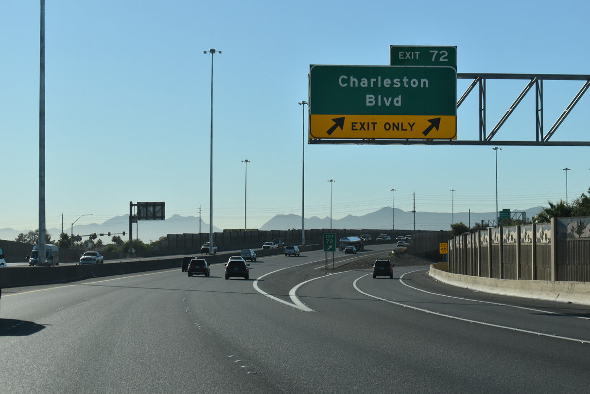 I-11/U.S. 93-95 curve south from Eastern Avenue ahead of Exit 72 to Charleston Boulevard (SR 159) and Exit 70 to Boulder Highway (SR 582).