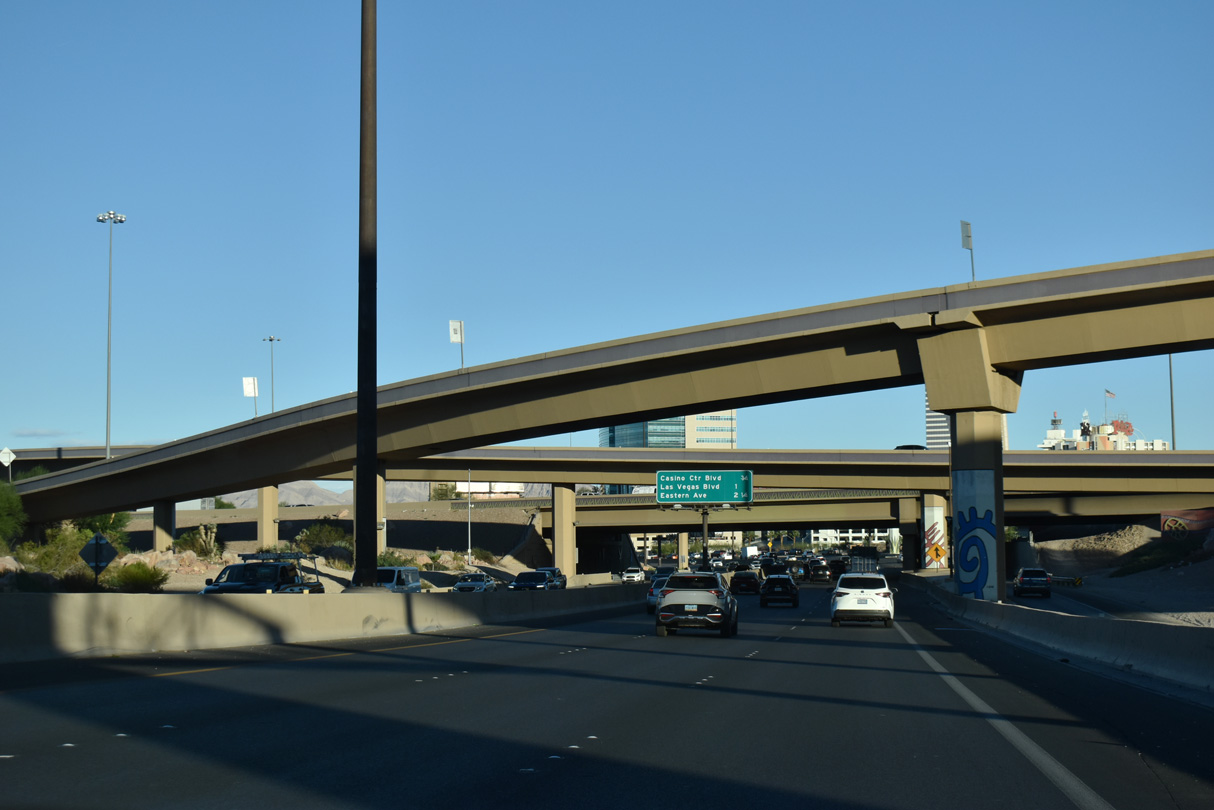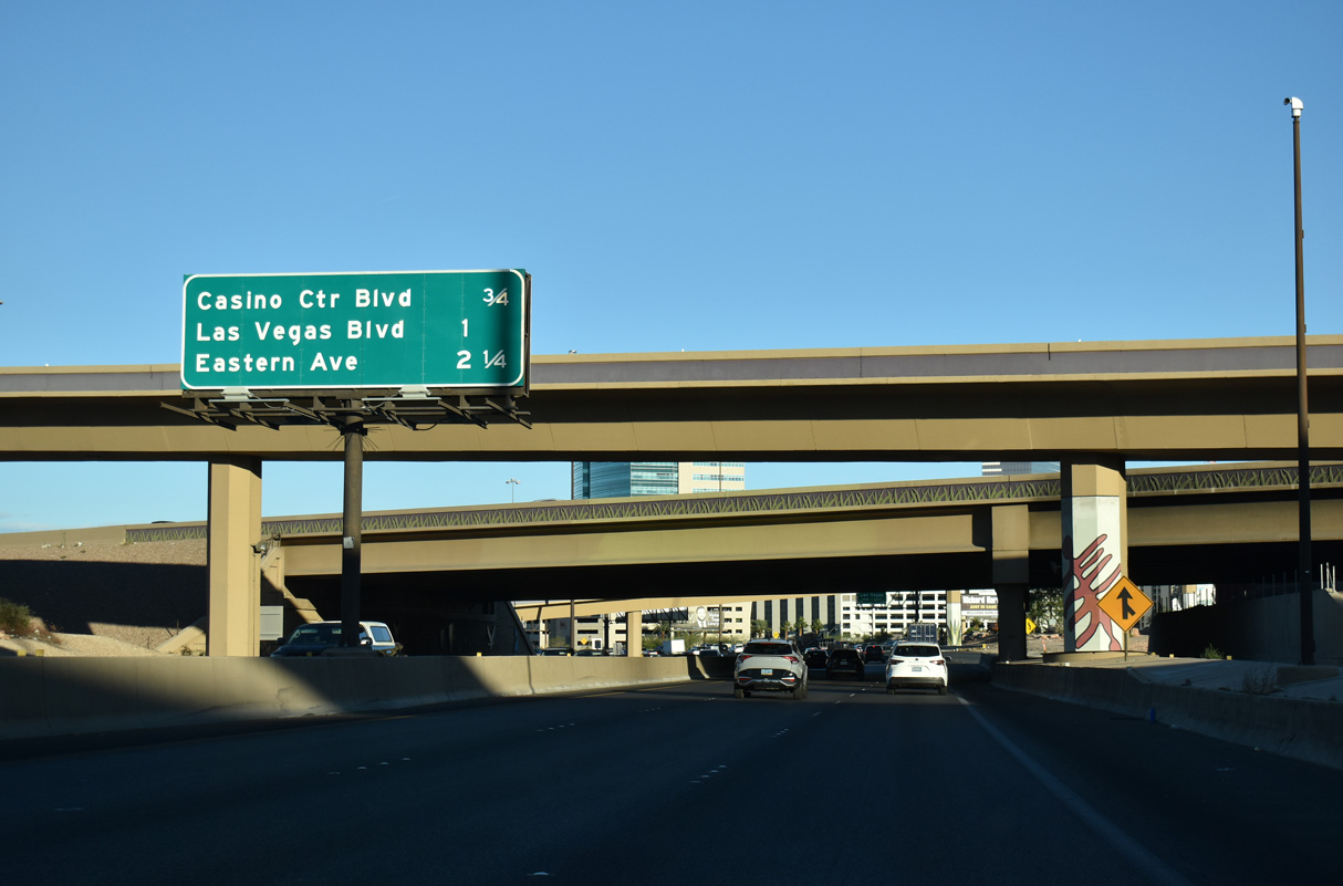 I-11/U.S. 93-95 (Oran K. Gragson Freeway) follow a viaduct east from City Parkway to Exit 75 B for Casino Center Boulevard to Downtown and Exit 73 to Eastern Avenue.