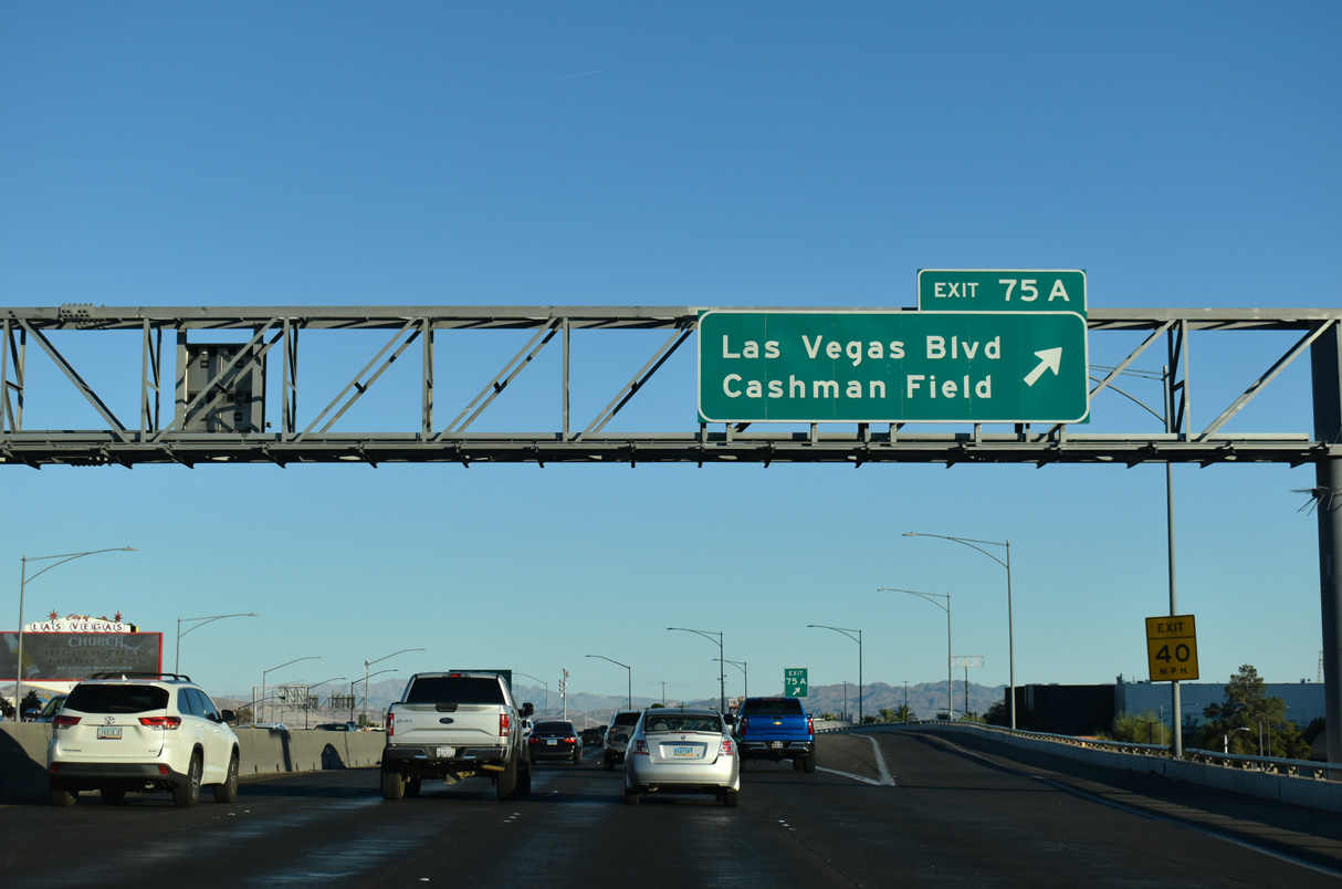 Exit 75 A departs for Las Vegas Boulevard. Las Vegas Boulevard represents the main thoroughfare connecting Downtown and the original casino area with the famous Las Vegas Strip further to the south. Extending north, Las Vegas Boulevard becomes SR 604 through North Las Vegas to Nellis Air Force Base.