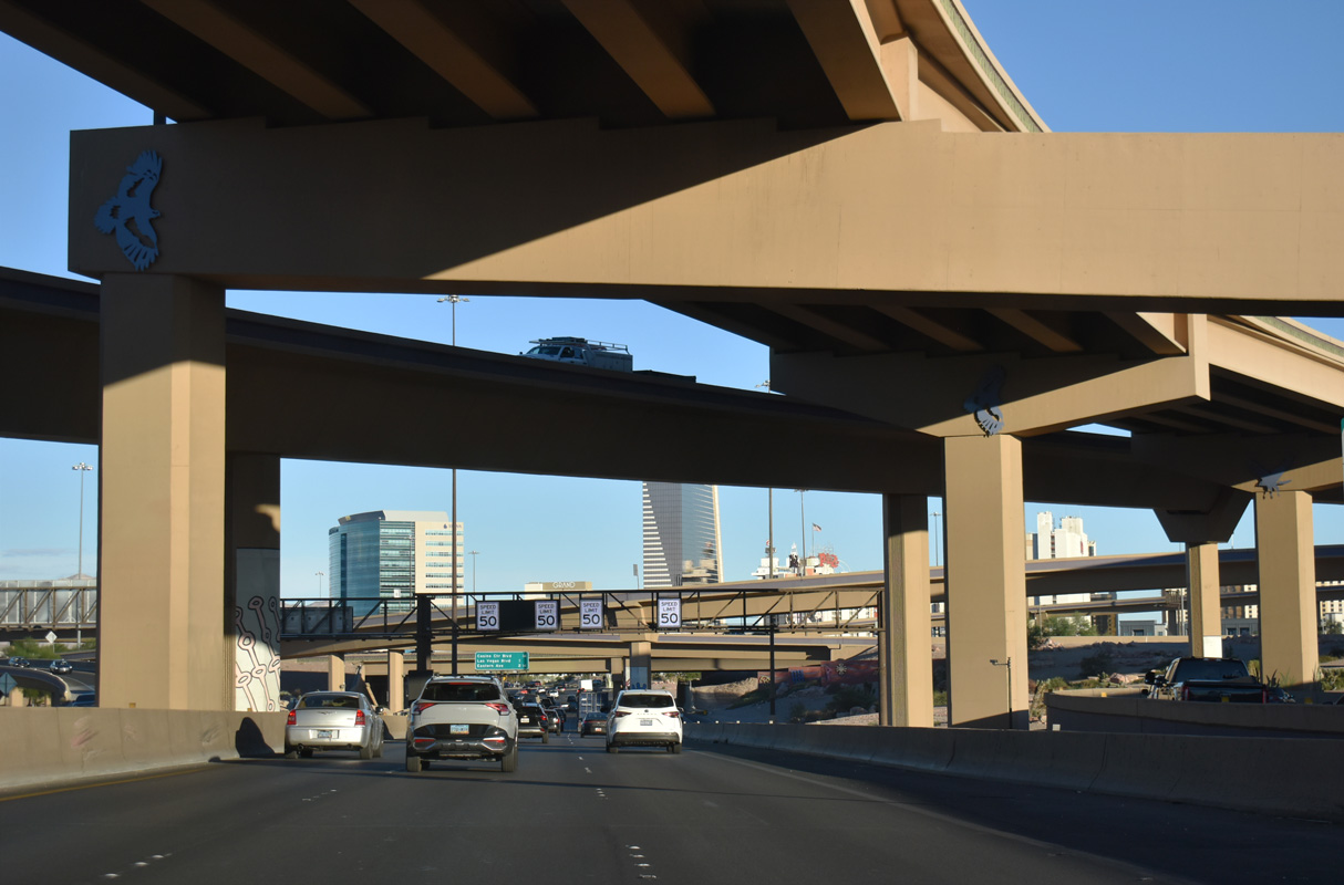A flyover brings U.S. 93 southbound onto I-11/U.S. 95 from Interstate 15 within the Spaghetti Bowl interchange.