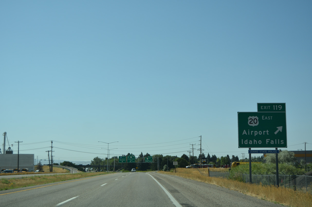 A parclo interchange joins Interstate 15 with Grandview Drive west to Idaho Falls Regional Airport (IDA) and U.S. 20 east ahead of Lindsay Boulevard.