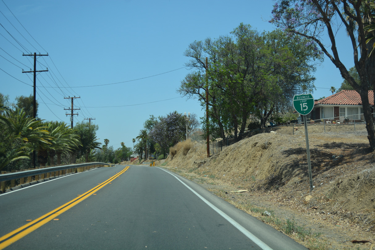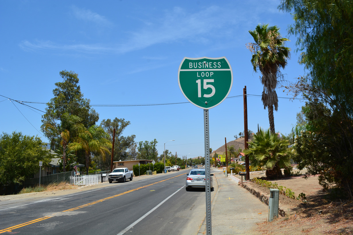 Just beyond the San Jacinto River, Business Loop I-15 turns north into Diamond Drive to rejoin Interstate 15. Old U.S. 395 and former SR 71 continue south onto Mission Trail to the city of Wildomar.