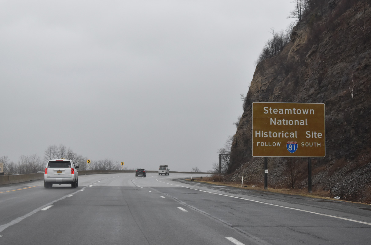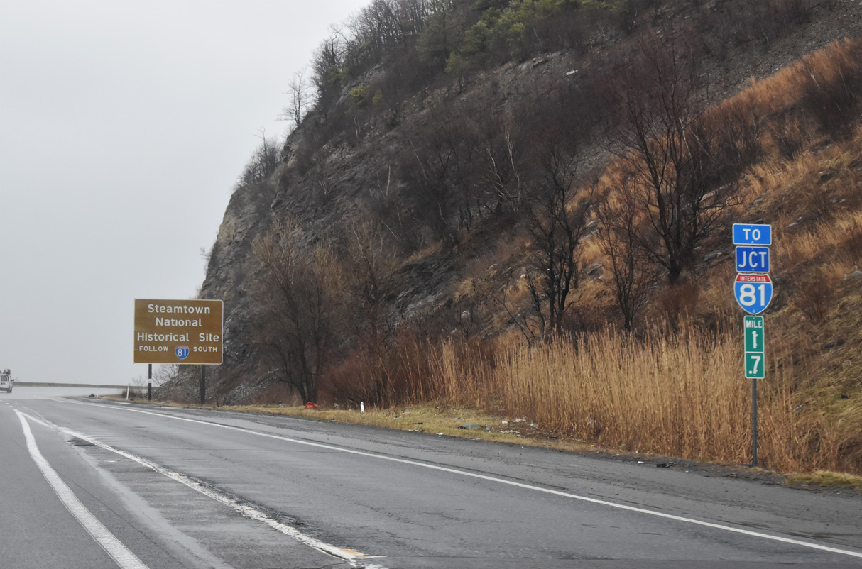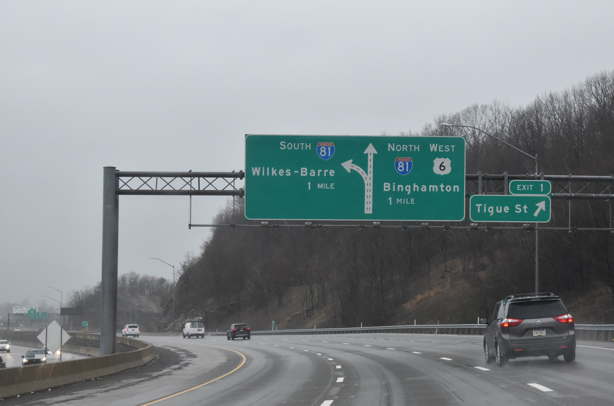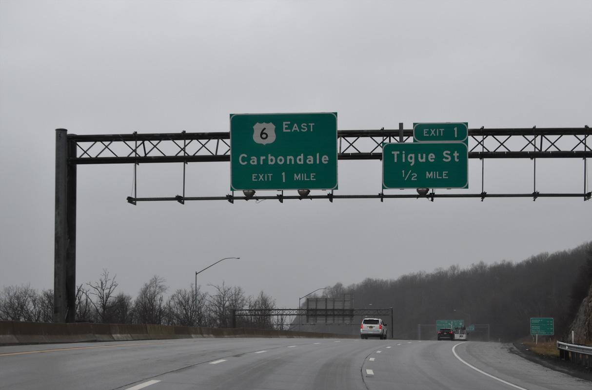 I-84/380 parallel Roaring Brook and a Delaware-Lackawanna Railroad line through a gap in the Moosic Mountains to Tigue Street (Exit 1) and the exchange with I-81/U.S. 6.
