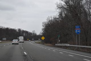 I-84 rises west from Peach Lake Brook onto Starr Ridge ahead of the directional cloverleaf interchange (Exit 68) with Interstate 684.