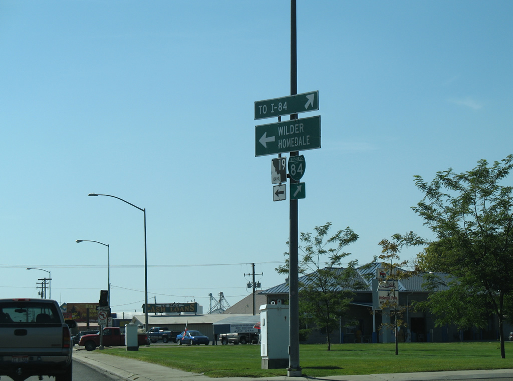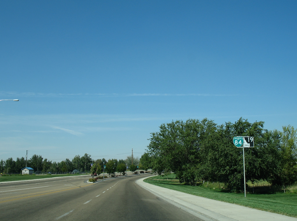 I-84/U.S. 20-26-30 proceed across the Boise River from the west end of Business Loop I-84 in Caldwell. SH 19 is posted alongside Centennial Way south to Simplot Boulevard, where the state highway branches west to Greenleaf and Wilder.