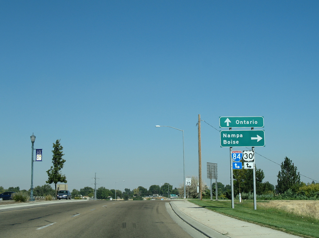 Removed with a sign replacement made after 2006, a second end shield for Business Loop I-84 appeared at the entrance ramp for U.S. 20/26 west to Notus and I-84/U.S. 30 northwest to Ontario.