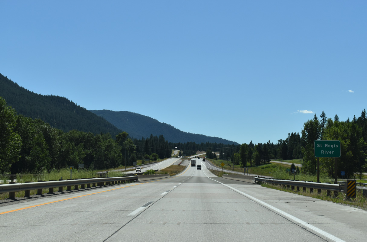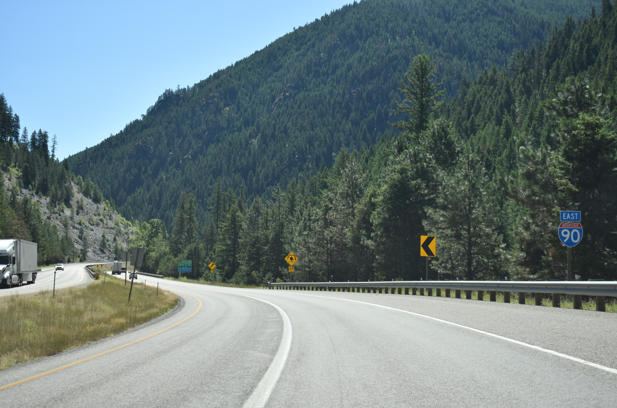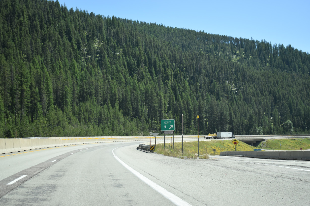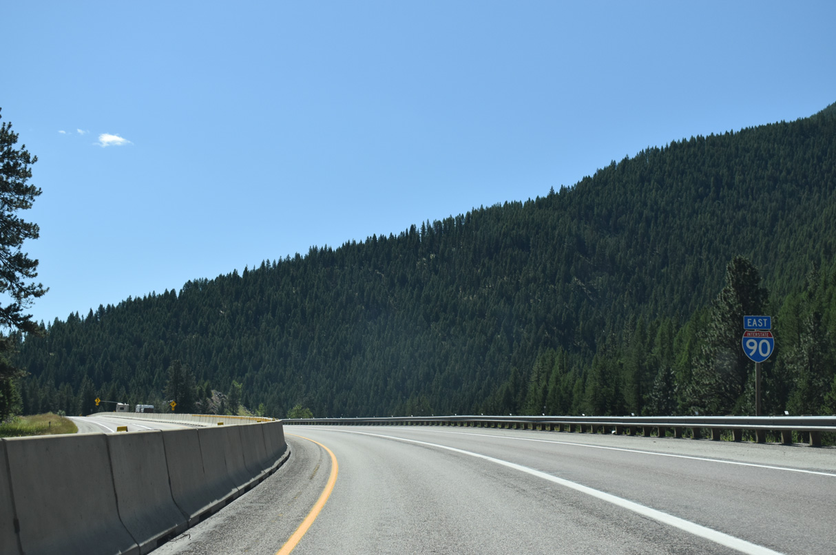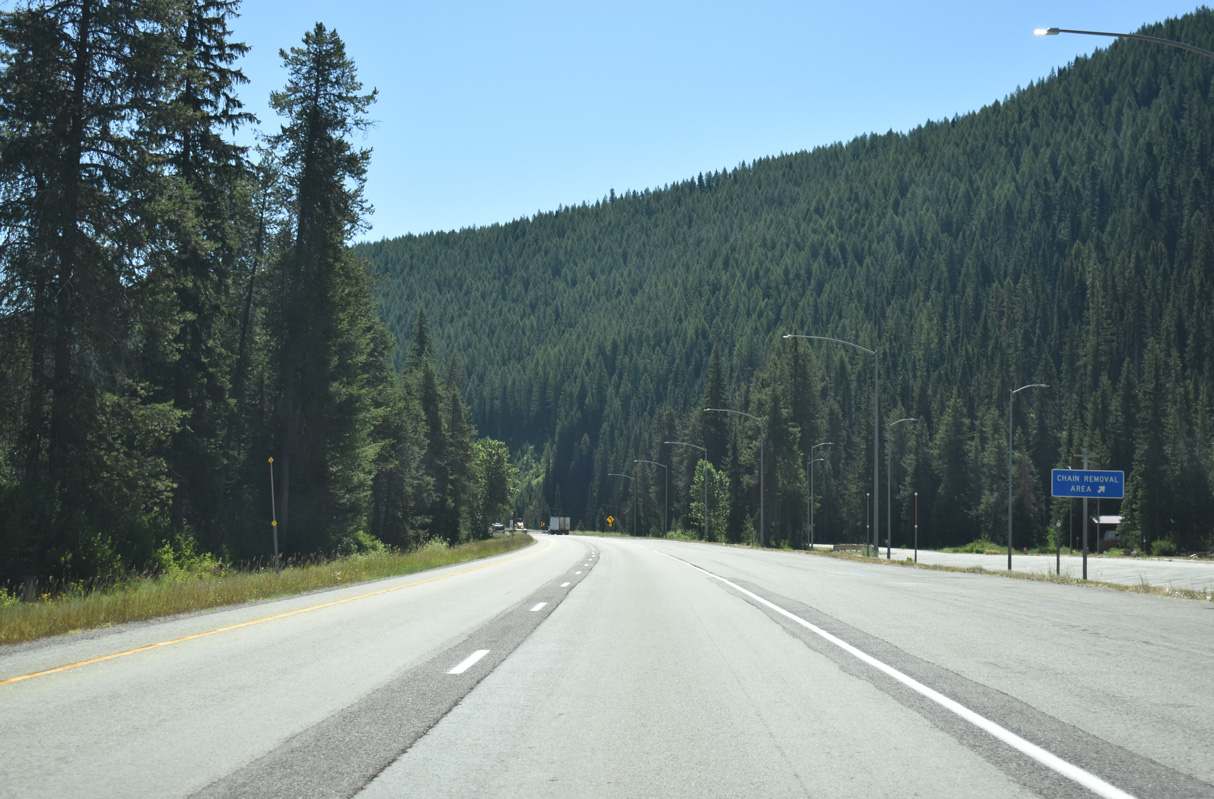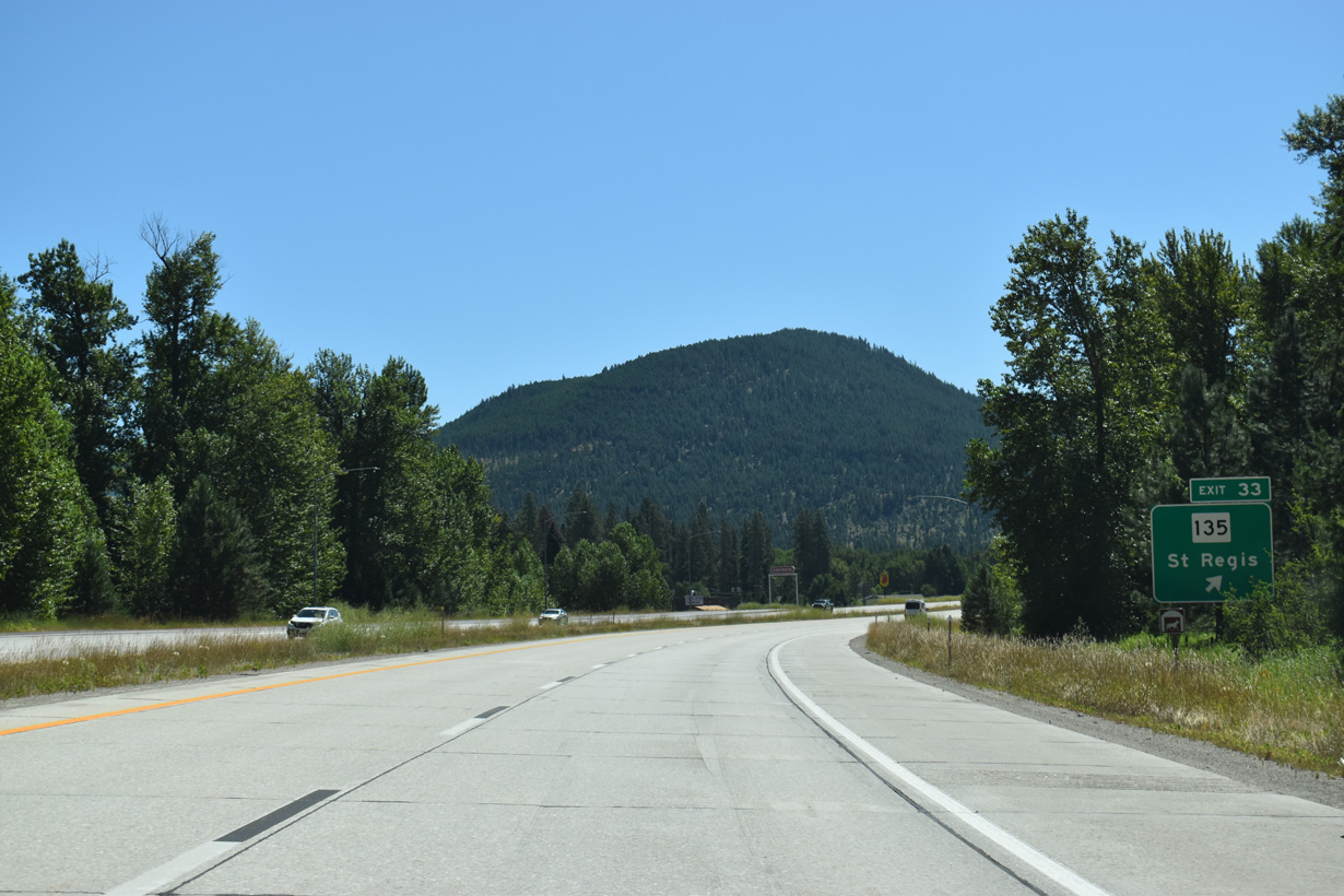 Interstate 90 enters Mineral County, Montana and Mountain Time Zone at Lookout Pass (elevation 4,725 feet). Roland Point (elevation 5,374 feet) in Shoshone County, Idaho rises beyond the Mineral County Route 174 overpass.