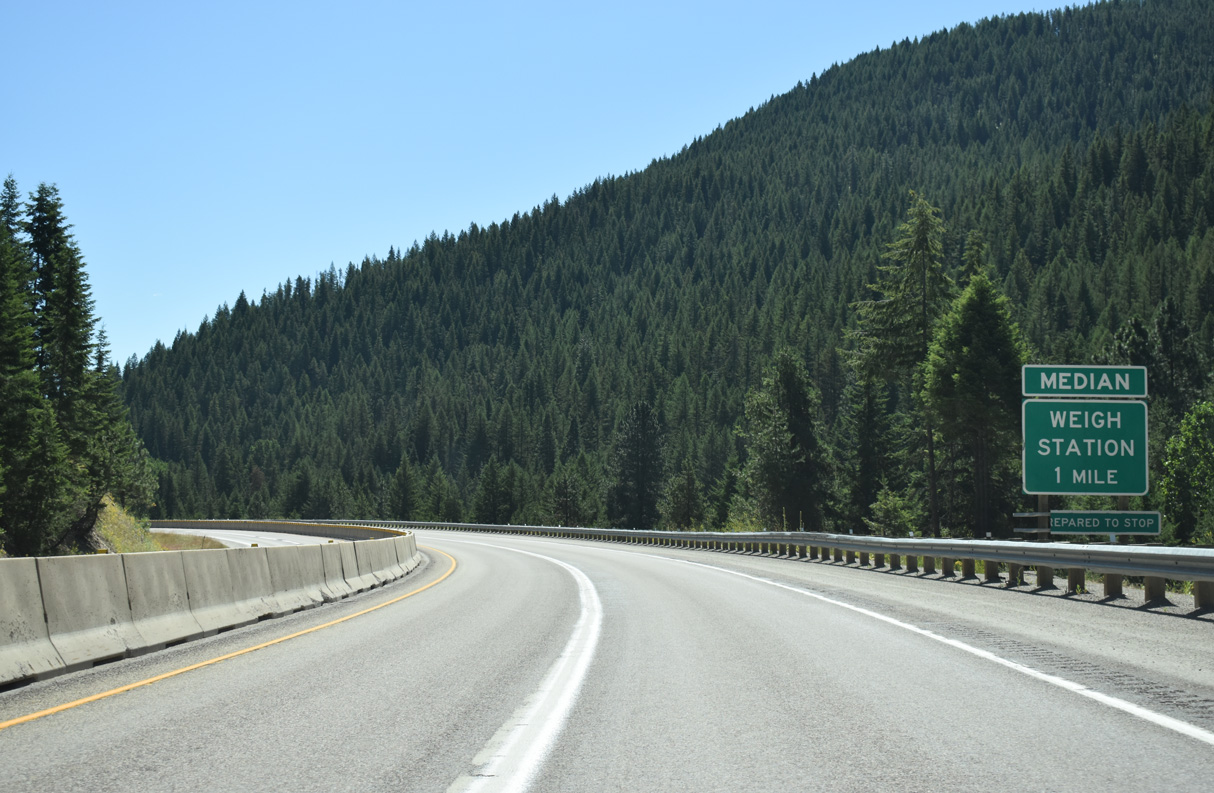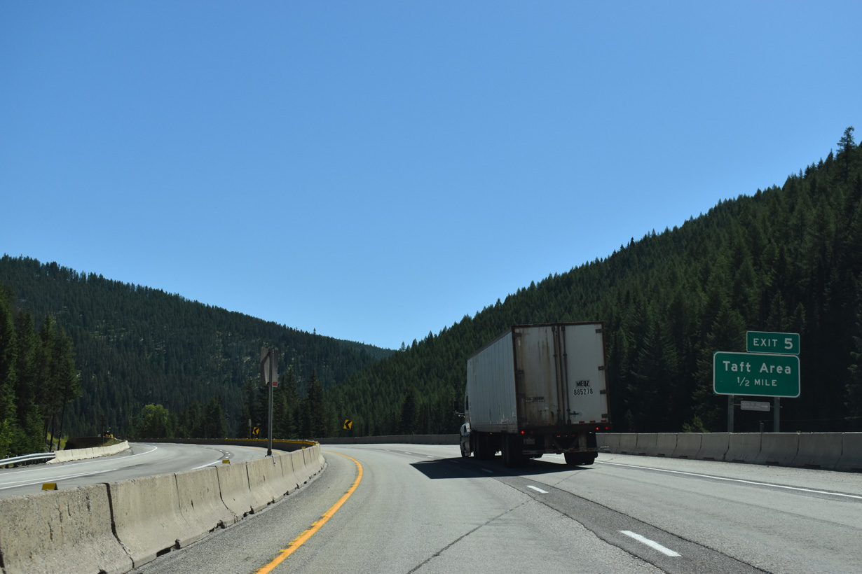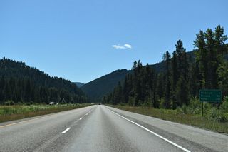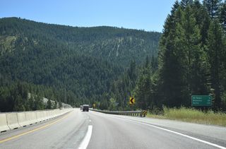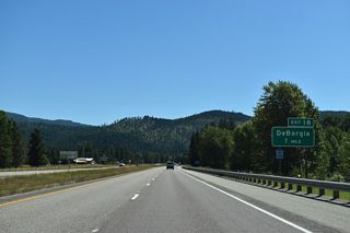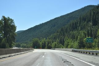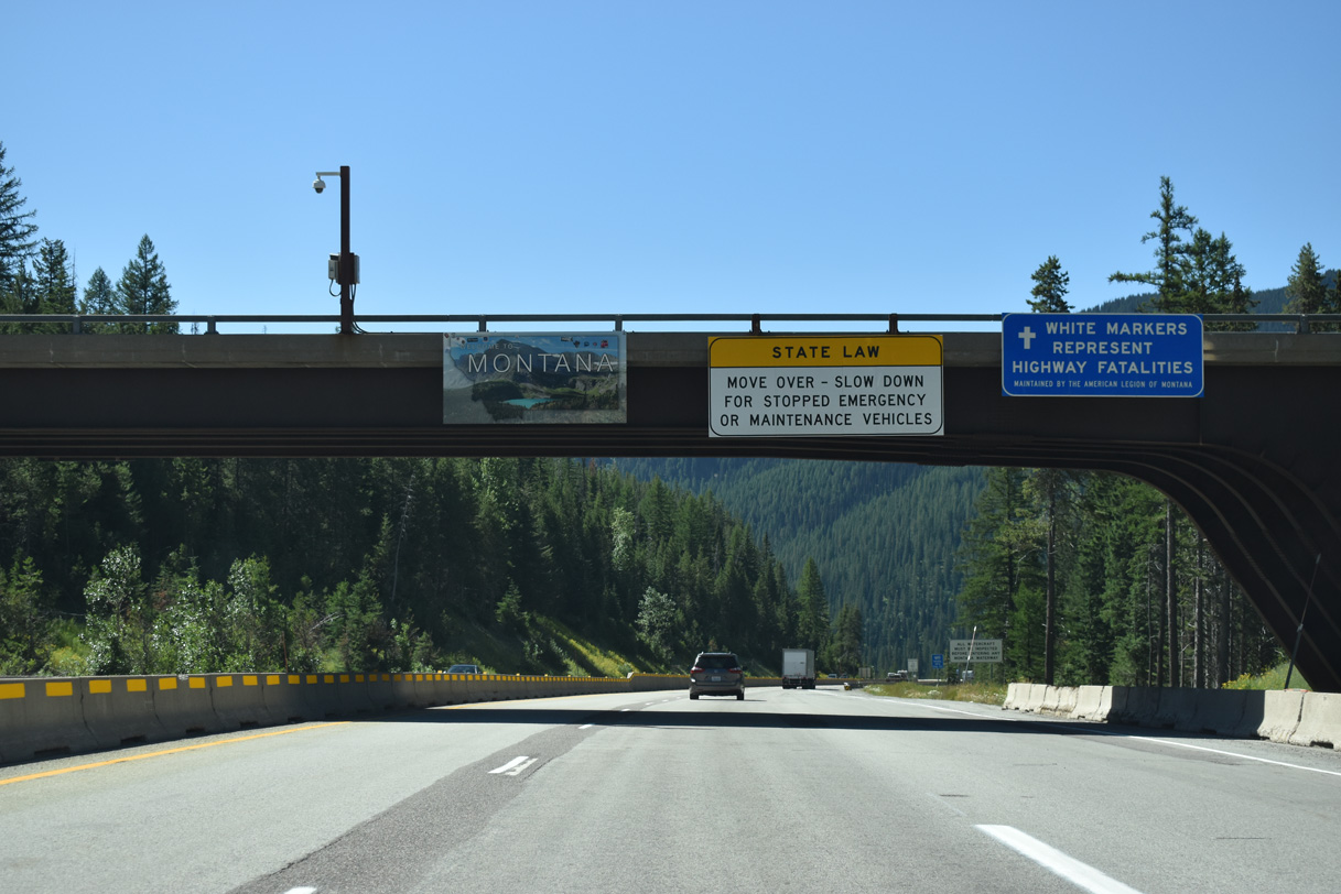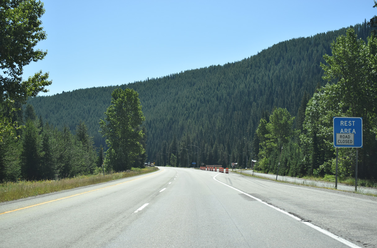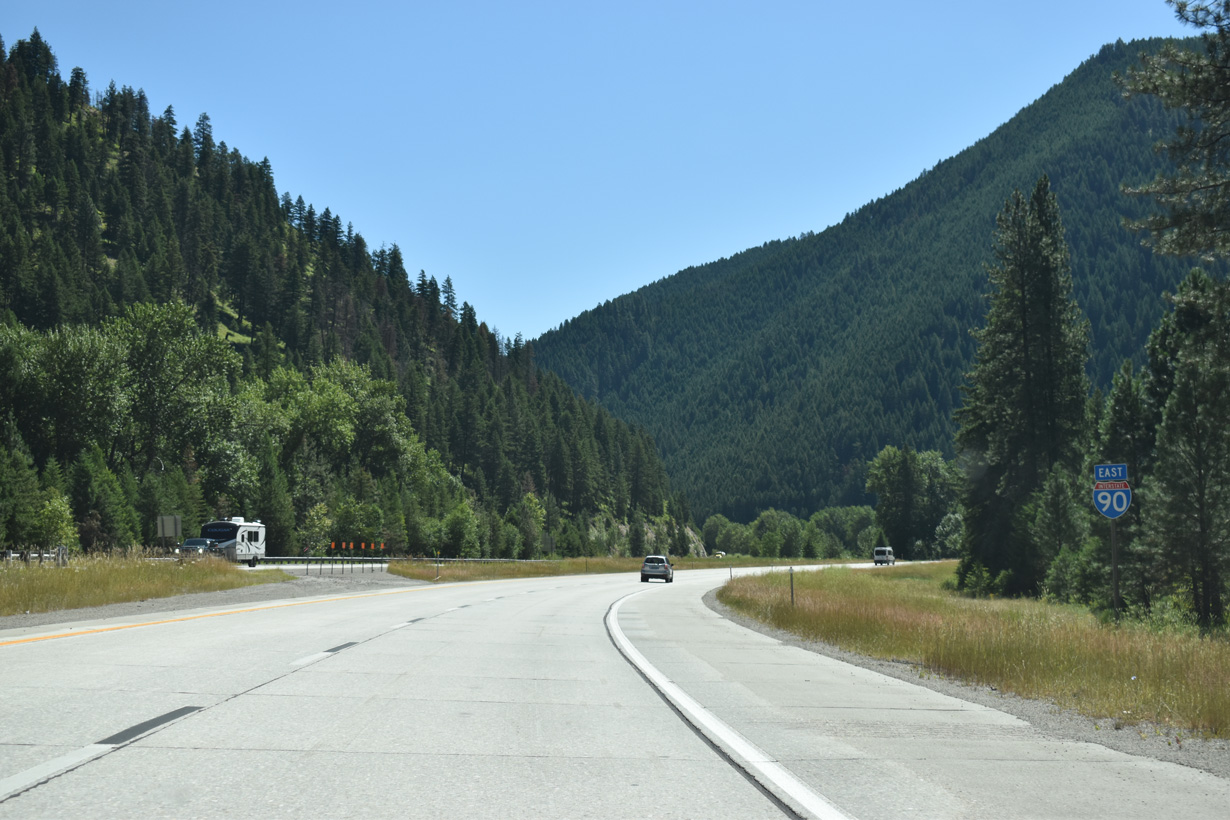 Interstate 90 enters Mineral County, Montana and Mountain Time Zone at Lookout Pass (elevation 4,725 feet). Roland Point (elevation 5,374 feet) in Shoshone County, Idaho rises beyond the Mineral County Route 174 overpass.