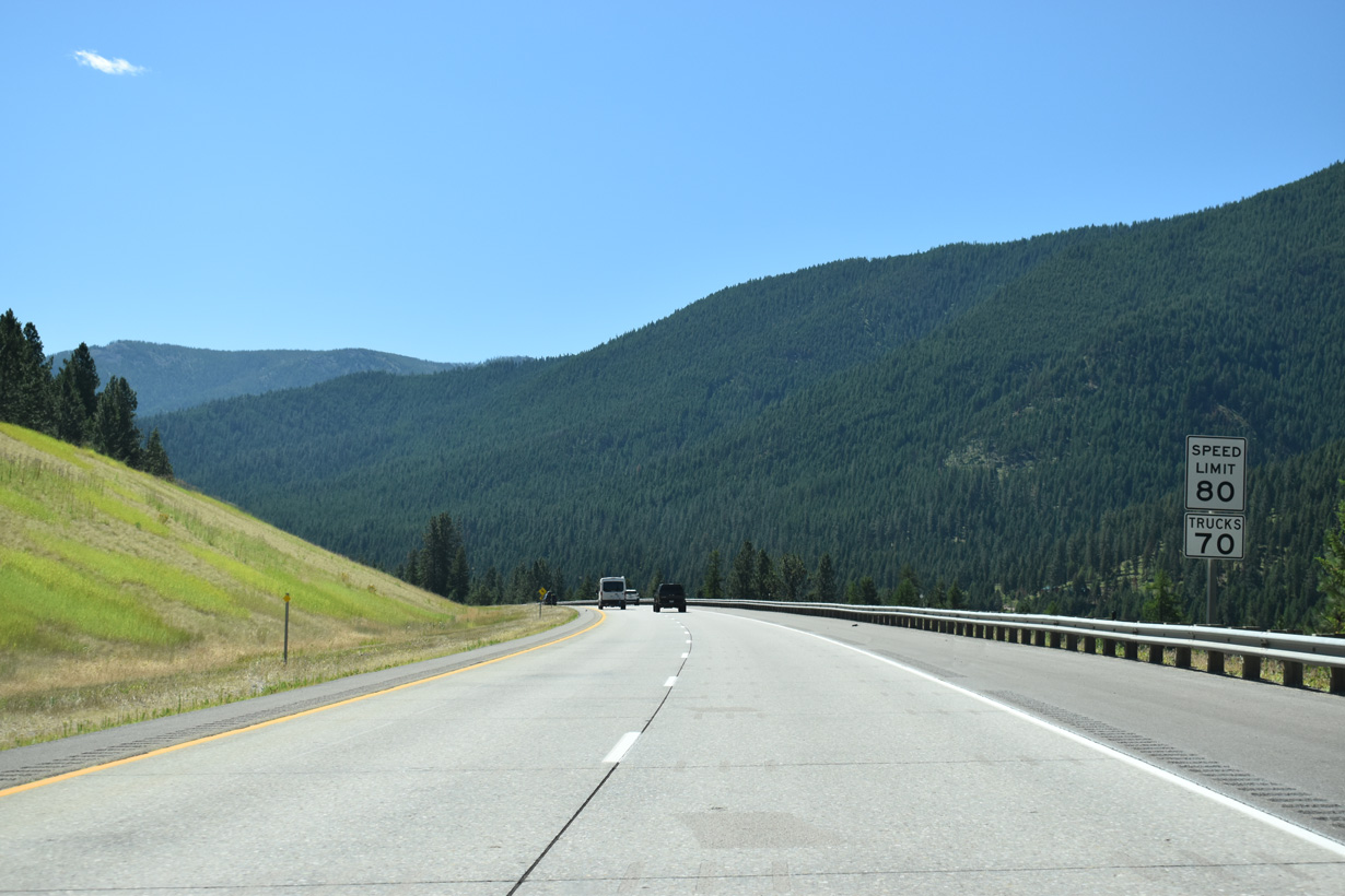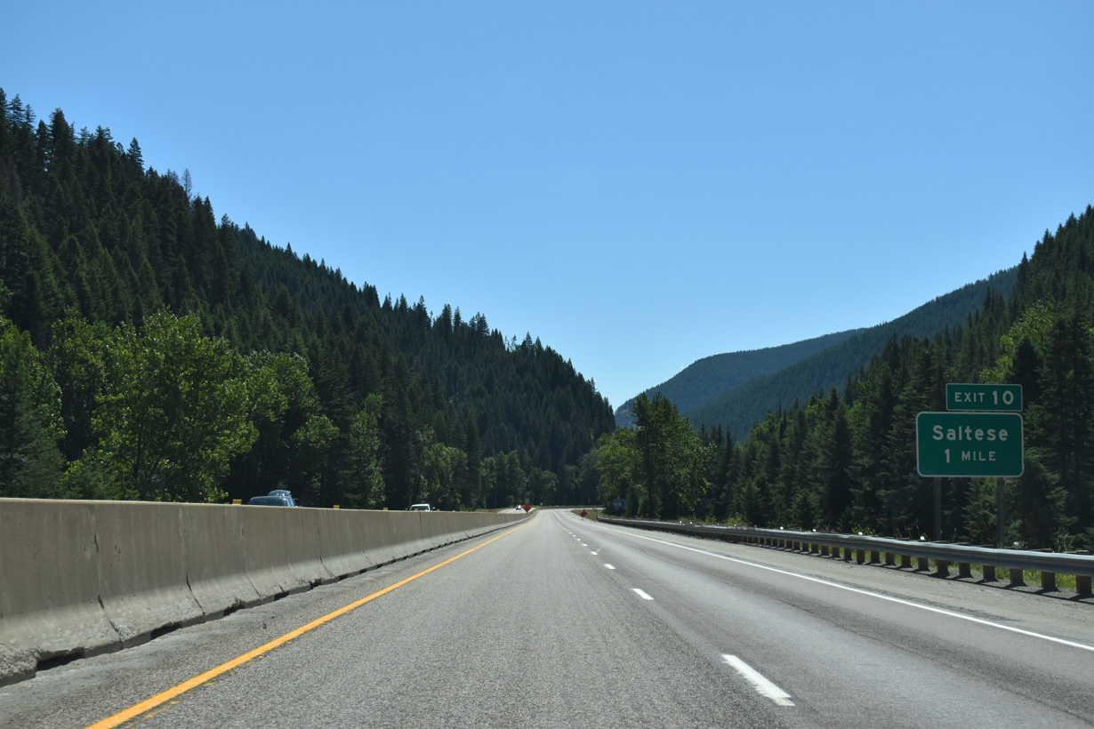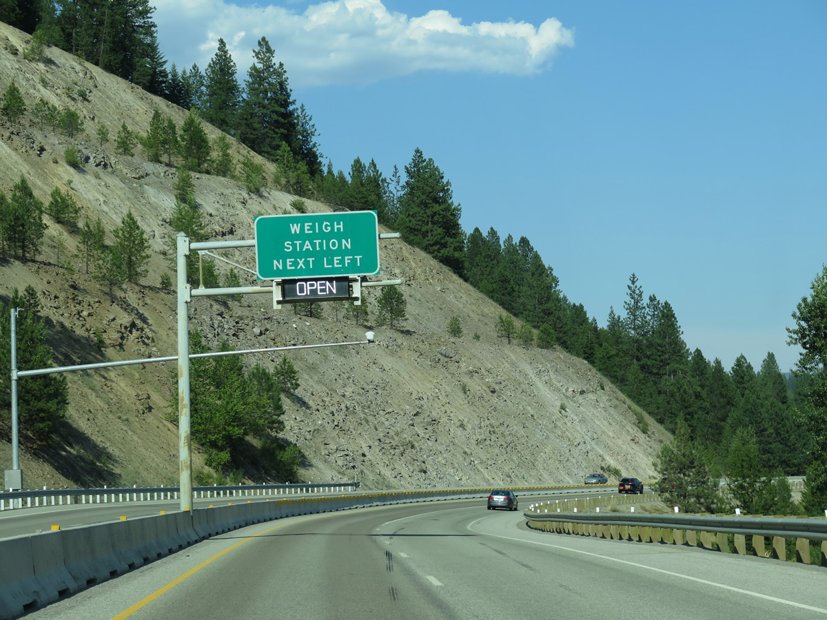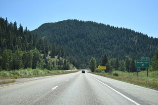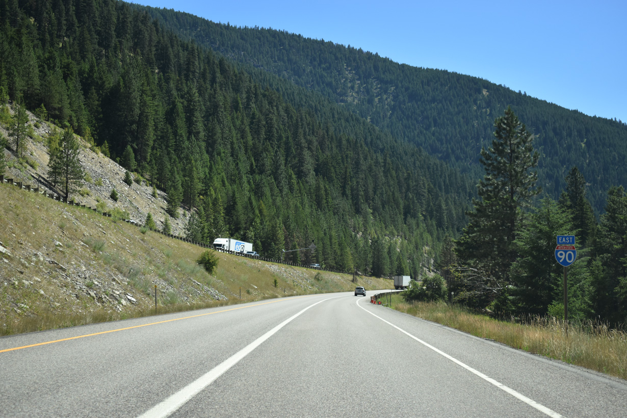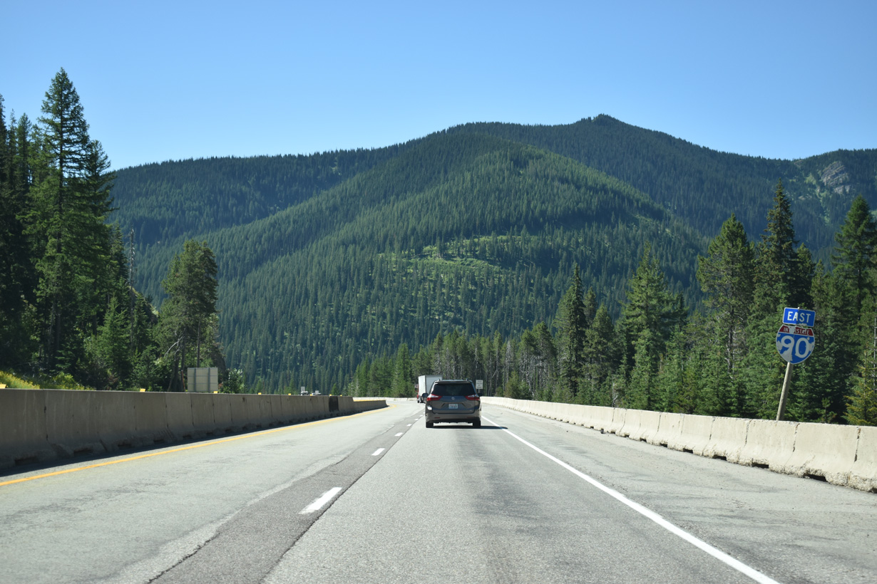 Interstate 90 enters Mineral County, Montana and Mountain Time Zone at Lookout Pass (elevation 4,725 feet). Roland Point (elevation 5,374 feet) in Shoshone County, Idaho rises beyond the Mineral County Route 174 overpass.