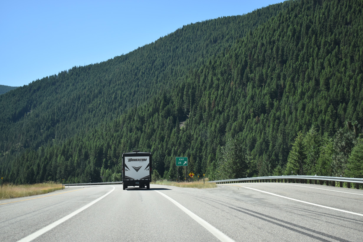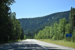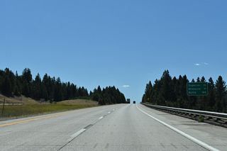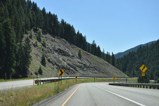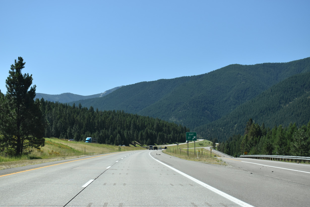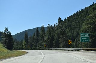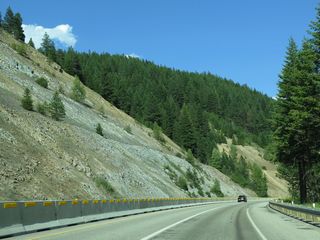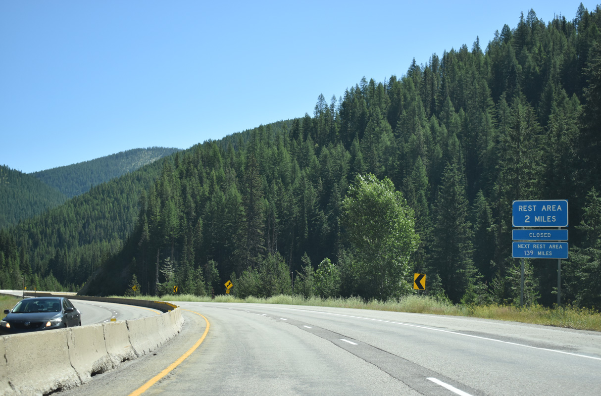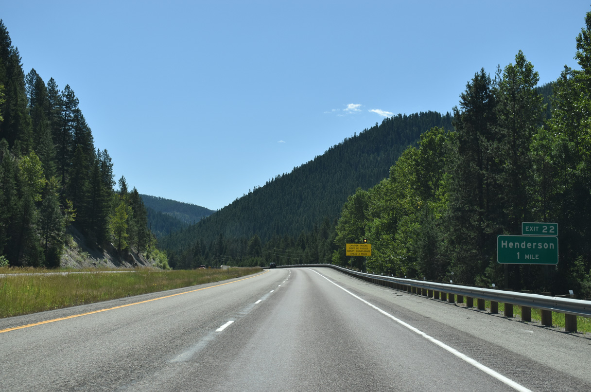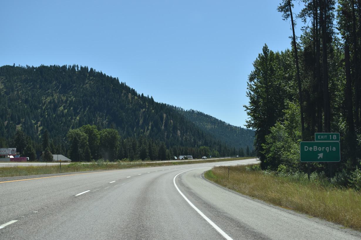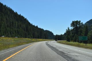 Interstate 90 enters Mineral County, Montana and Mountain Time Zone at Lookout Pass (elevation 4,725 feet). Roland Point (elevation 5,374 feet) in Shoshone County, Idaho rises beyond the Mineral County Route 174 overpass.