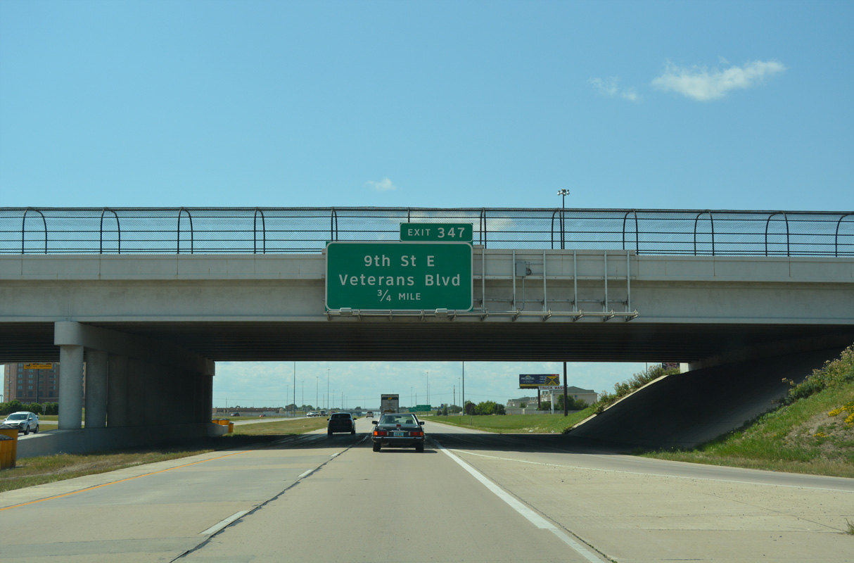 The first of three exits for the city of West Fargo on I-94/U.S. 52 west is with 9th Street E and Veterans Boulevard south. The parclo interchange at Exit 347 opened following a ribbon cutting ceremony held on October 1, 2009.