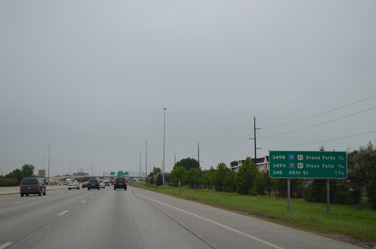 Exit 349 A loops onto I-29/U.S. 81 south toward Sioux Falls, South Dakota and Omaha, Nebraska. A high flyover travels above between I-29/U.S. 81 south to I-94/U.S. 52 east. Interstate 29 leaves Fargo at 52nd Avenue S and Frontier and reaches I-90 at Sioux Falls in 232 miles.