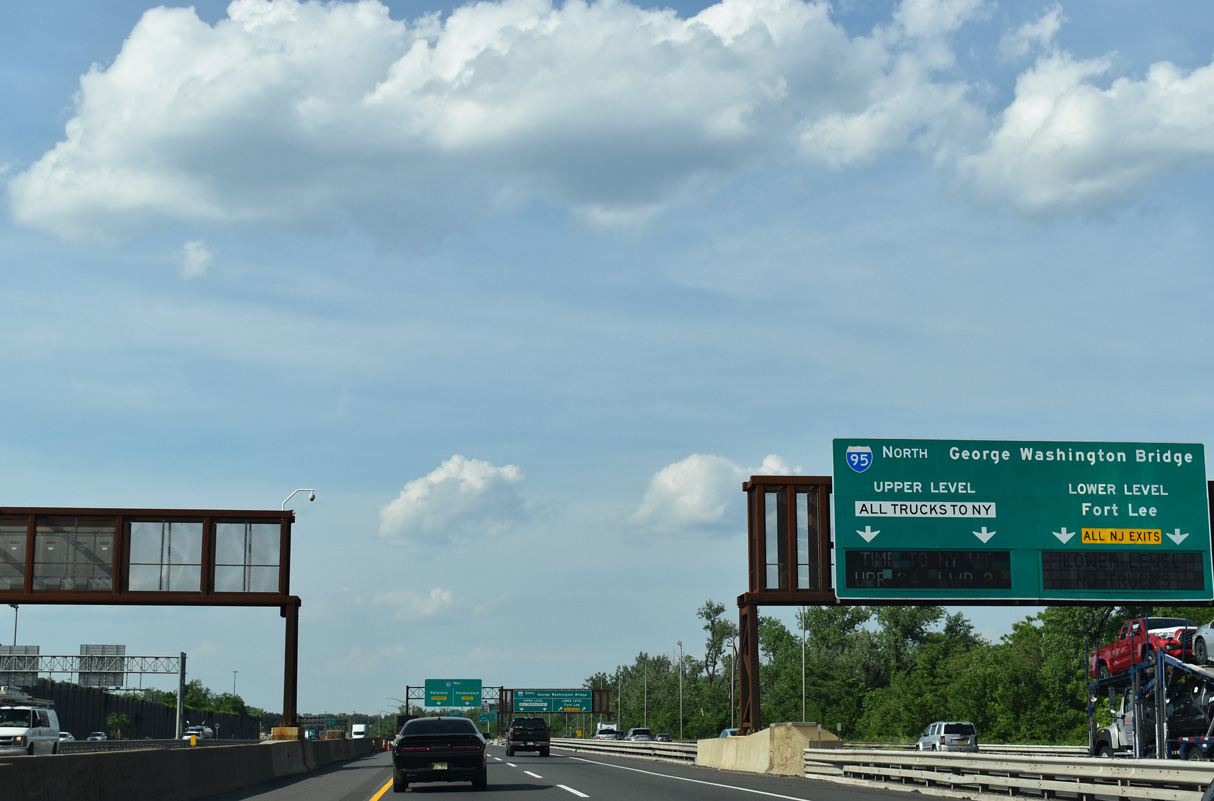 The local lanes of Interstate 95 partition into roadways for the upper and lower decks of the George Washington Bridge ahead of the Exit 72 off-ramp to U.S. 9W (Fletcher Avenue).